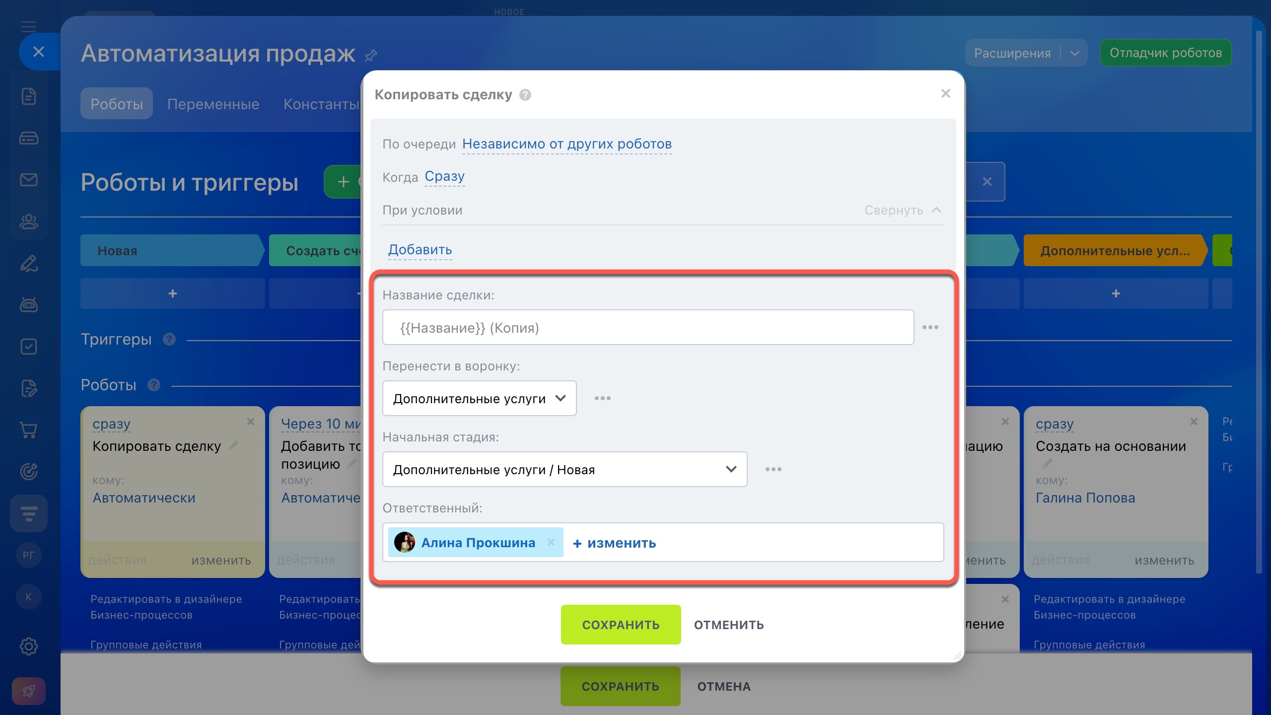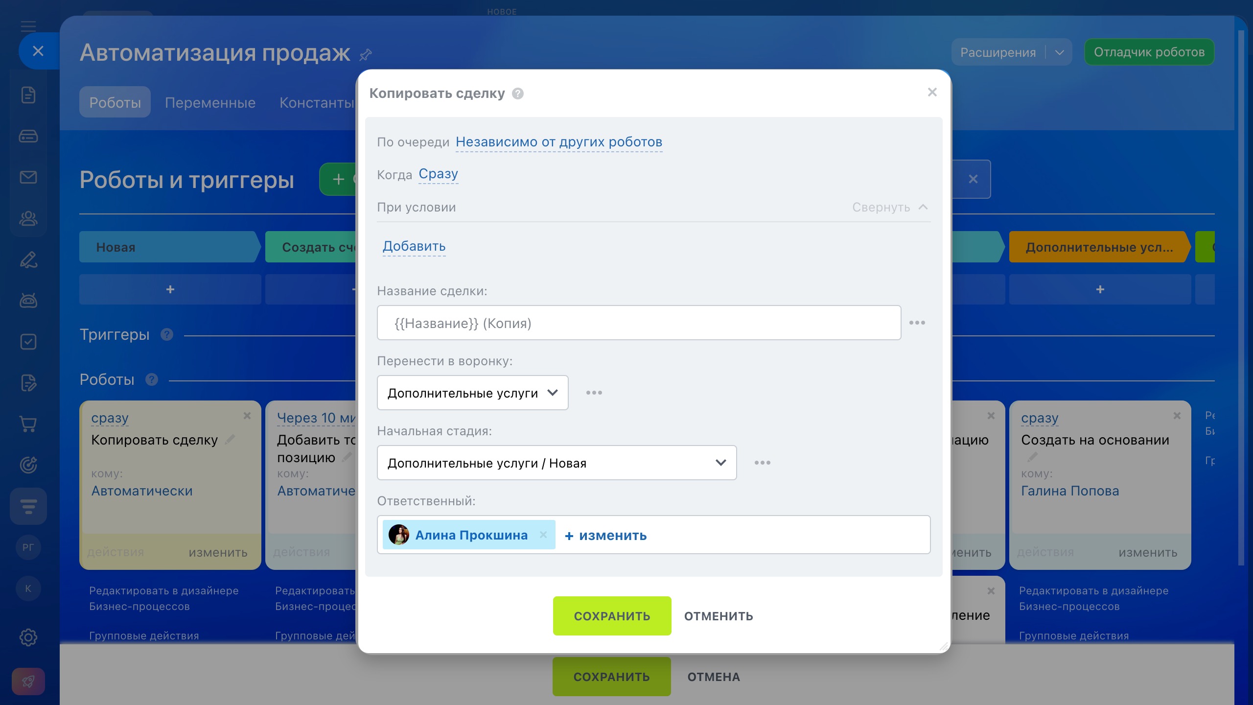 Когда сделка попадает на определенную стадию, робот создает ее копию на другой стадии или в другой воронке. Все данные из полей переносятся в копию сделки. Например, когда вы успешно завершаете сделку по продаже оборудования, робот копирует ее в воронку установки оборудования.