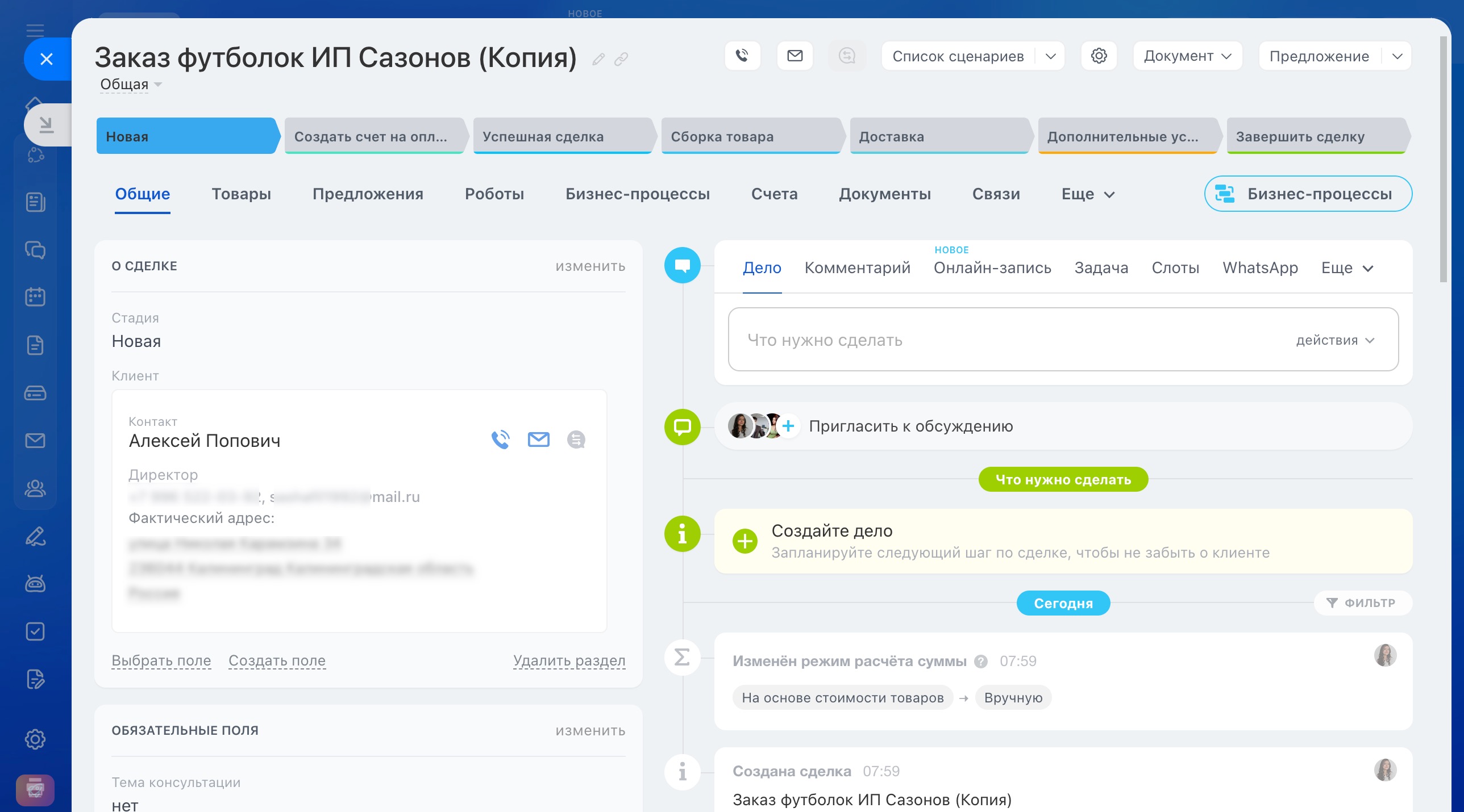 - Выбрать клиента — если в карточке несколько контактов, можно добавить в дело одного или всех. Это поможет менеджеру связаться с нужным клиентом.