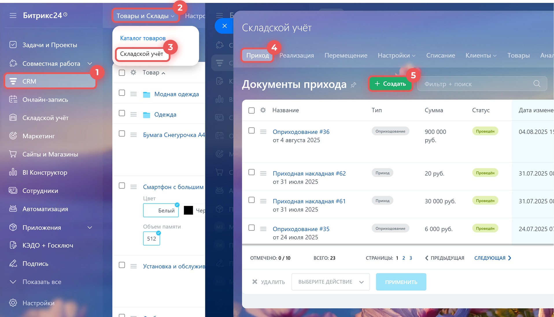 В статье расскажем, как создать документ прихода в веб-версии Битрикс24 и мобильном приложении.