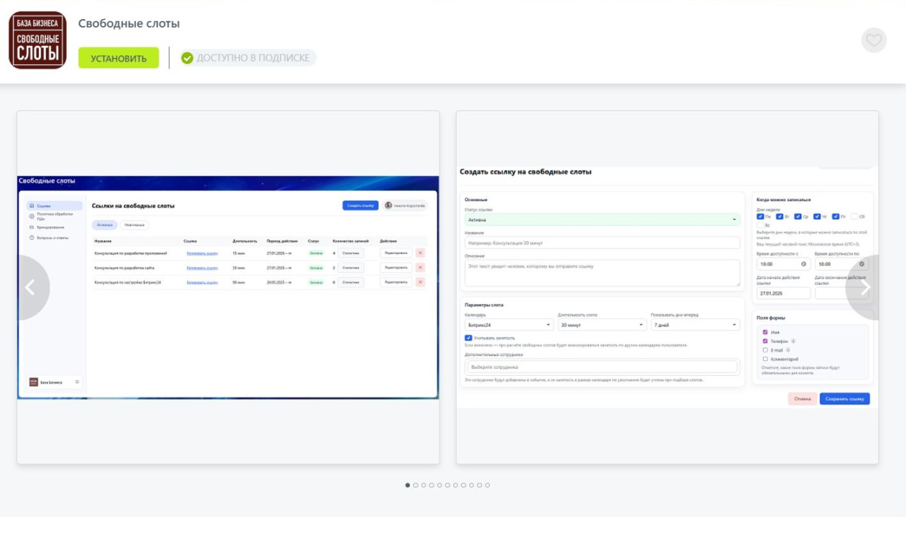 - Слоты рассчитываются на основе календаря владельца ссылки и (по выбору) других календарей/сотрудников.