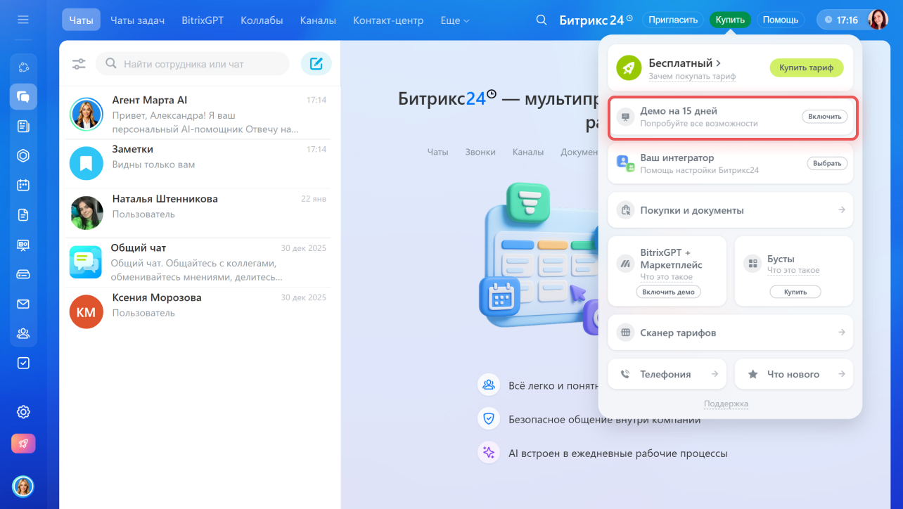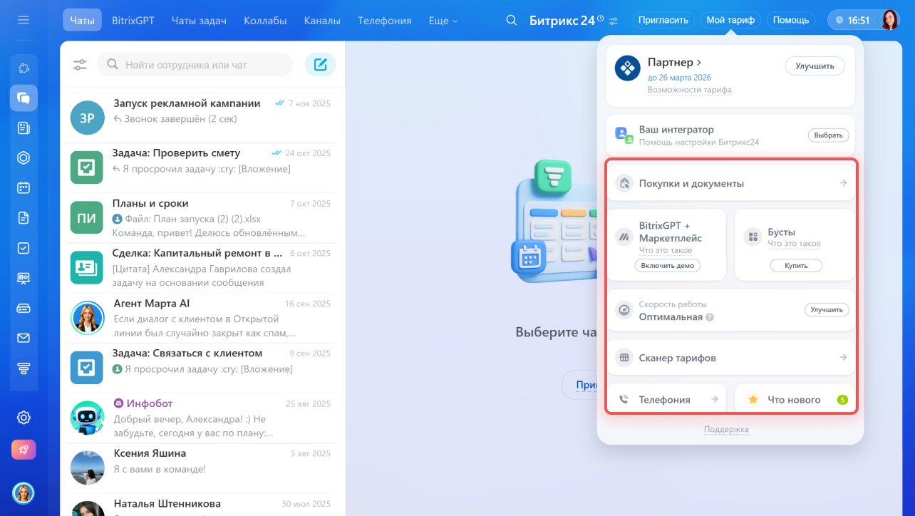 - Управлять платными возможностями — купить подписку BitrixGPT + Маркетплейс, бусты, пополнить баланс телефонии.