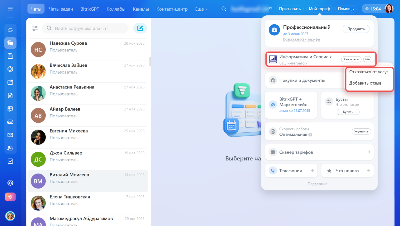 Если вы отказались от работы с интегратором, Битрикс24 автоматически создаст чат, где администраторы получат уведомление о прекращении сотрудничества.