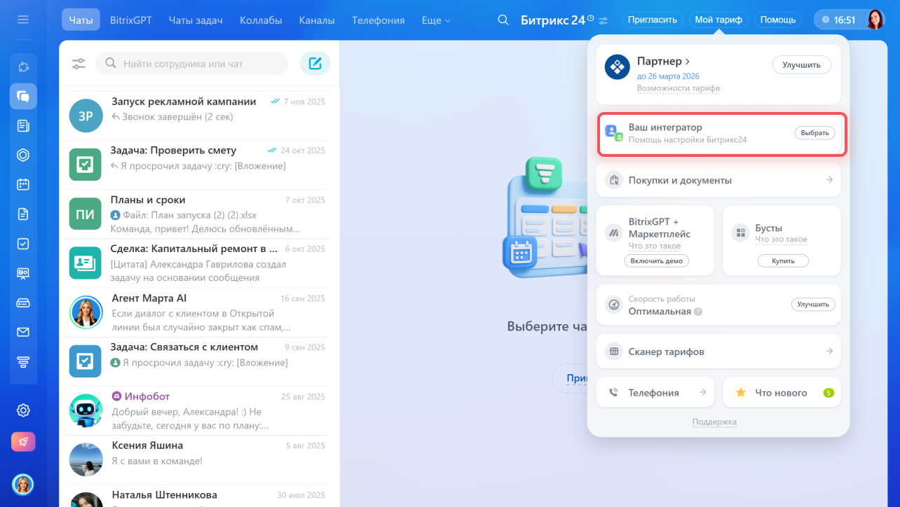 Связаться с интегратором. В этом блоке отображается информация об интеграторе, если он работает с вашим Битрикс24. Вы можете: