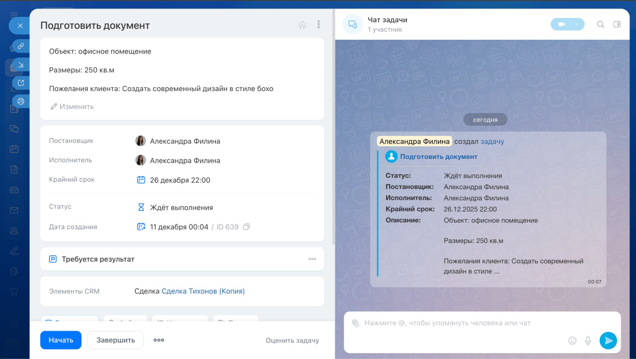 В задачу автоматически добавились участники, а в описании появились данные из карточки сделки: вид проекта, размеры объекта, пожелания клиента.