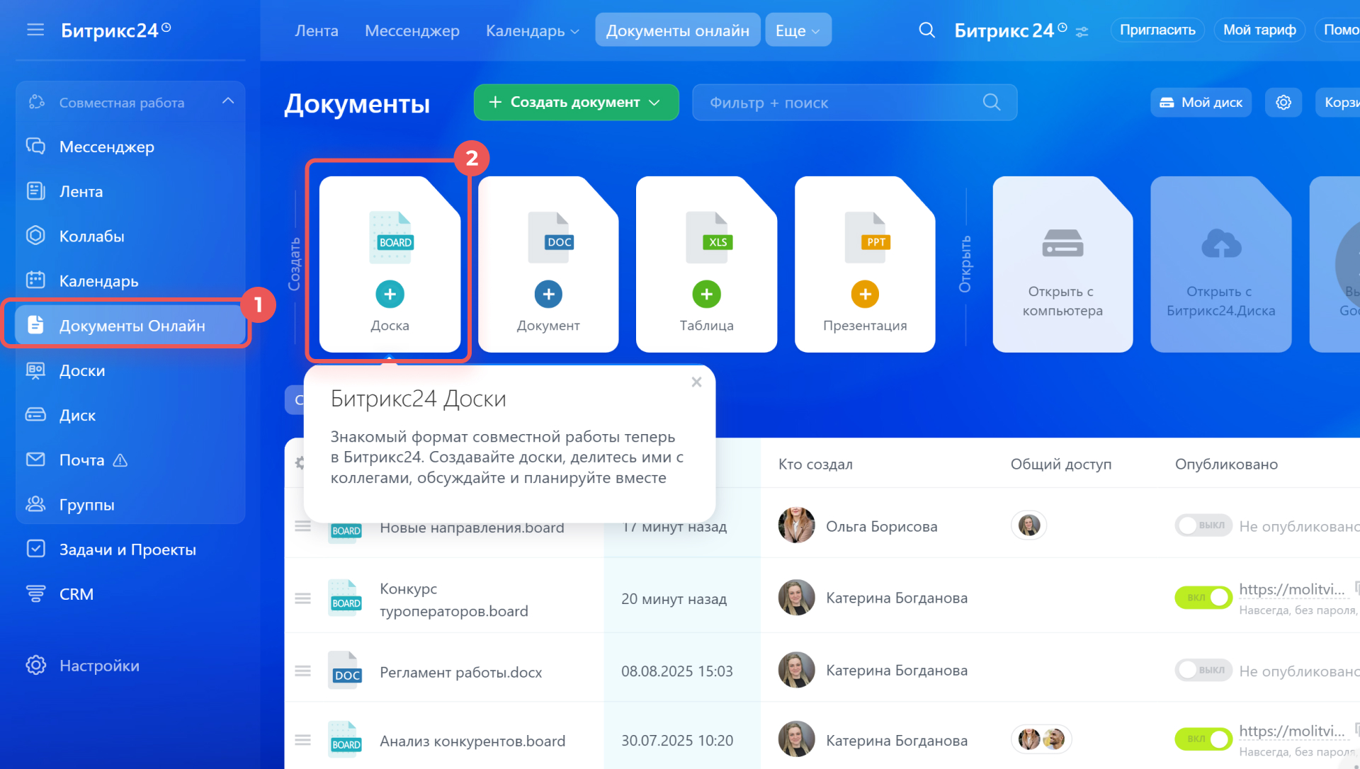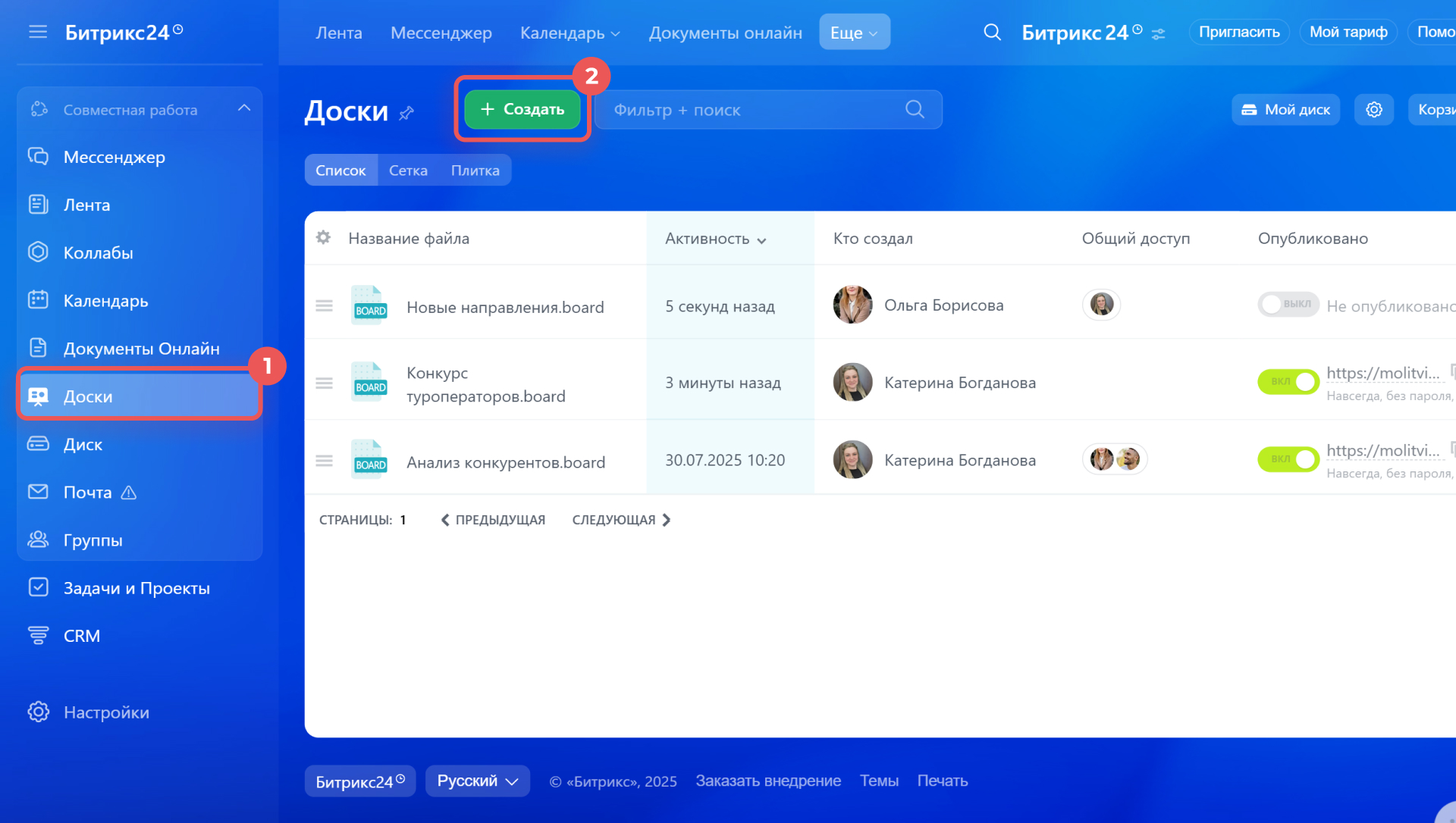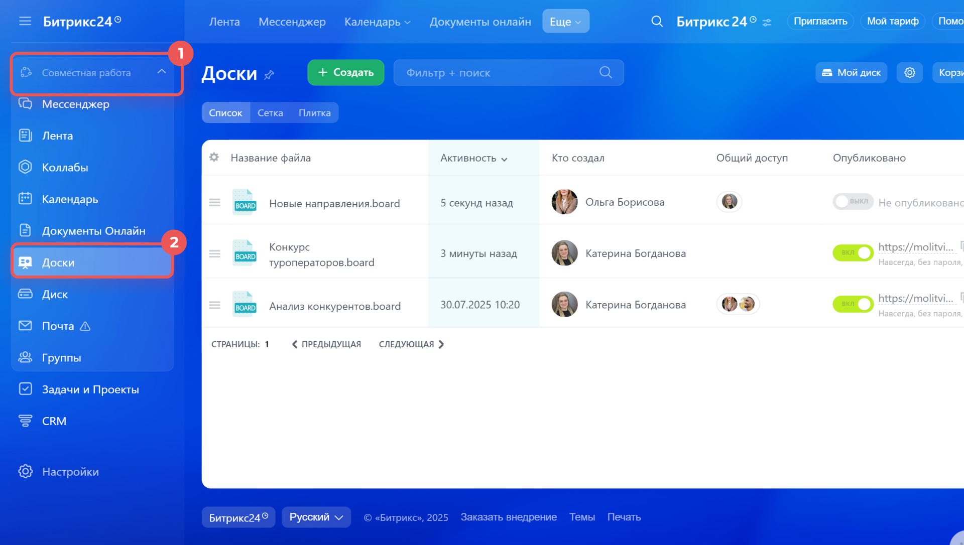 Раздел с досками находится в блоке Совместная работа. Вы можете создавать новые доски, работать с существующими, делиться ими с коллегами и внешними участниками. Каждый сотрудник видит только свои доски и те, к которым у него есть доступ. Если сотрудник уволен, доступ к доскам закрывается автоматически — данные компании остаются в безопасности.