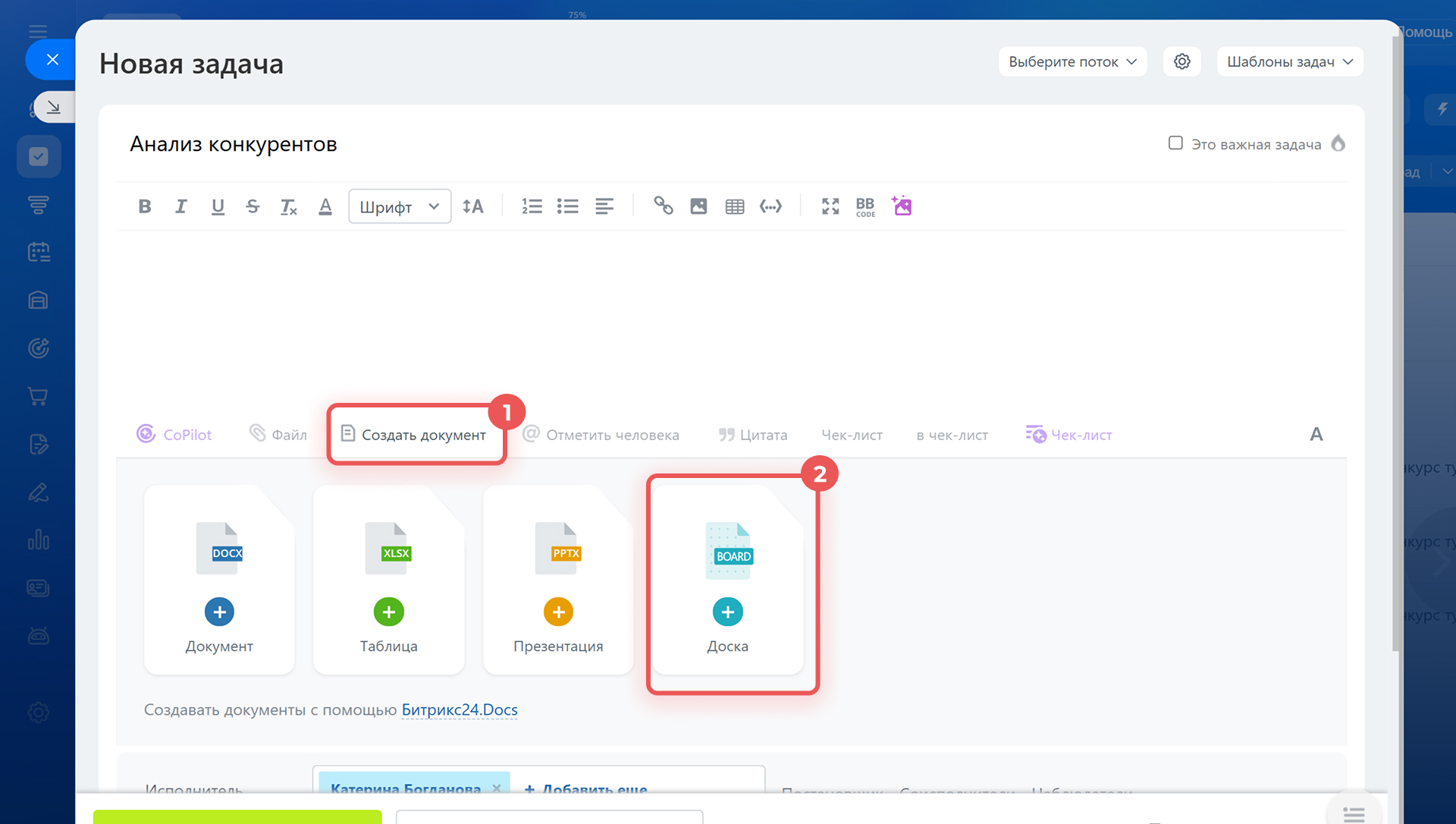 Интеграция с другими инструментами Битрикс24. Доски можно использовать вместе с другими инструментами: