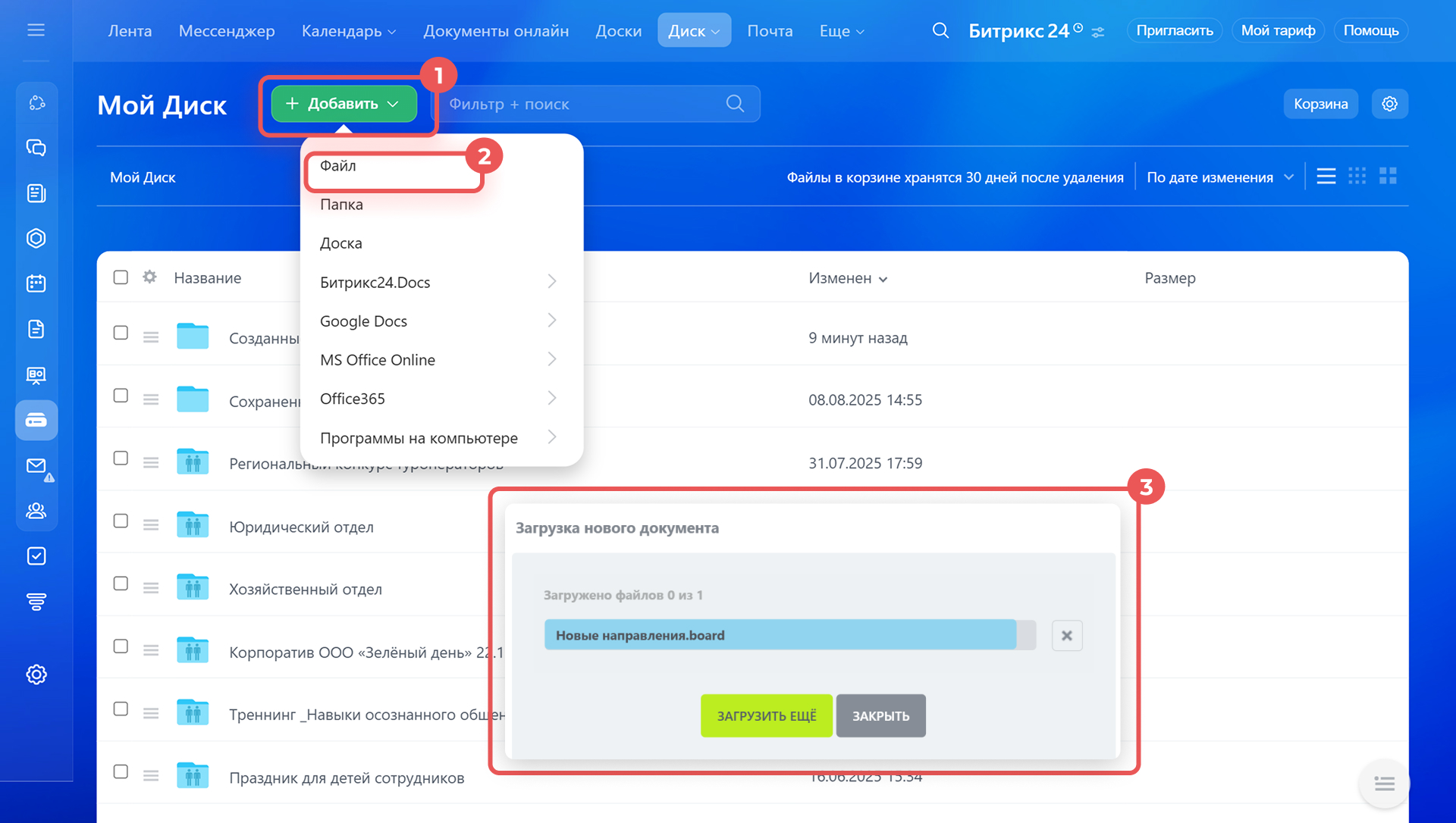 Импорт досок из Flip. Если команда раньше работала в сервисе Flip, можно перенести доски в Битрикс24. Загрузите файл в формате board на Диск, и весь контент сохранится. После импорта доску можно изменять, дополнять и отправлять коллегам. Так вы сможете продолжить работу без необходимости создавать все заново.