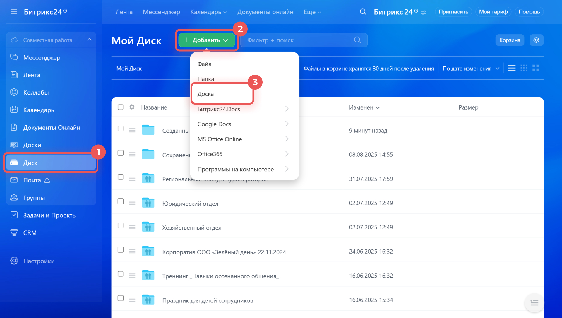 - Диск — храните доски вместе с другими документами и файлами для удобного доступа и организации данных. Например, добавьте доску с планом проекта и связанные файлы в одну папку. Это упростит команде поиск нужной информации.