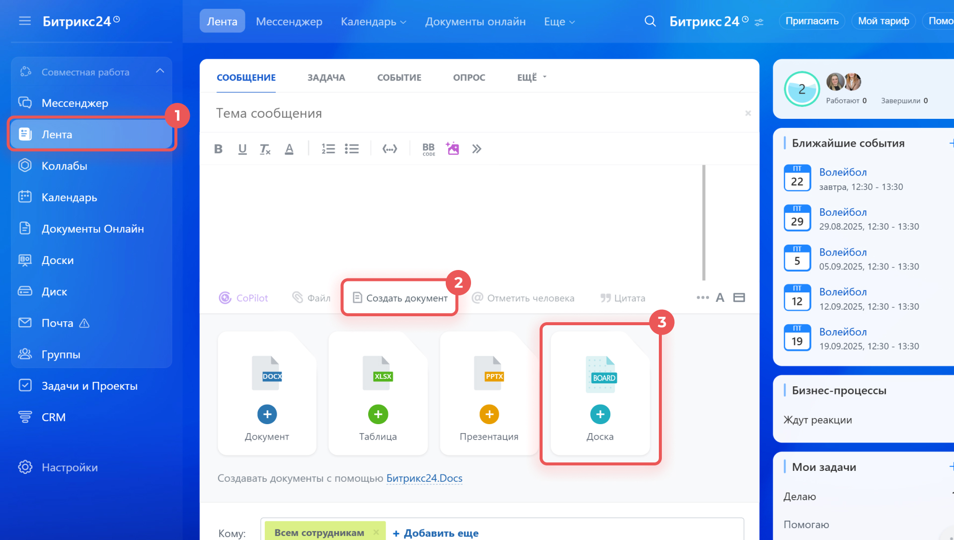 - Доски можно использовать вместе с другими инструментами Битрикс24: лентой, задачами, чатами и диском.