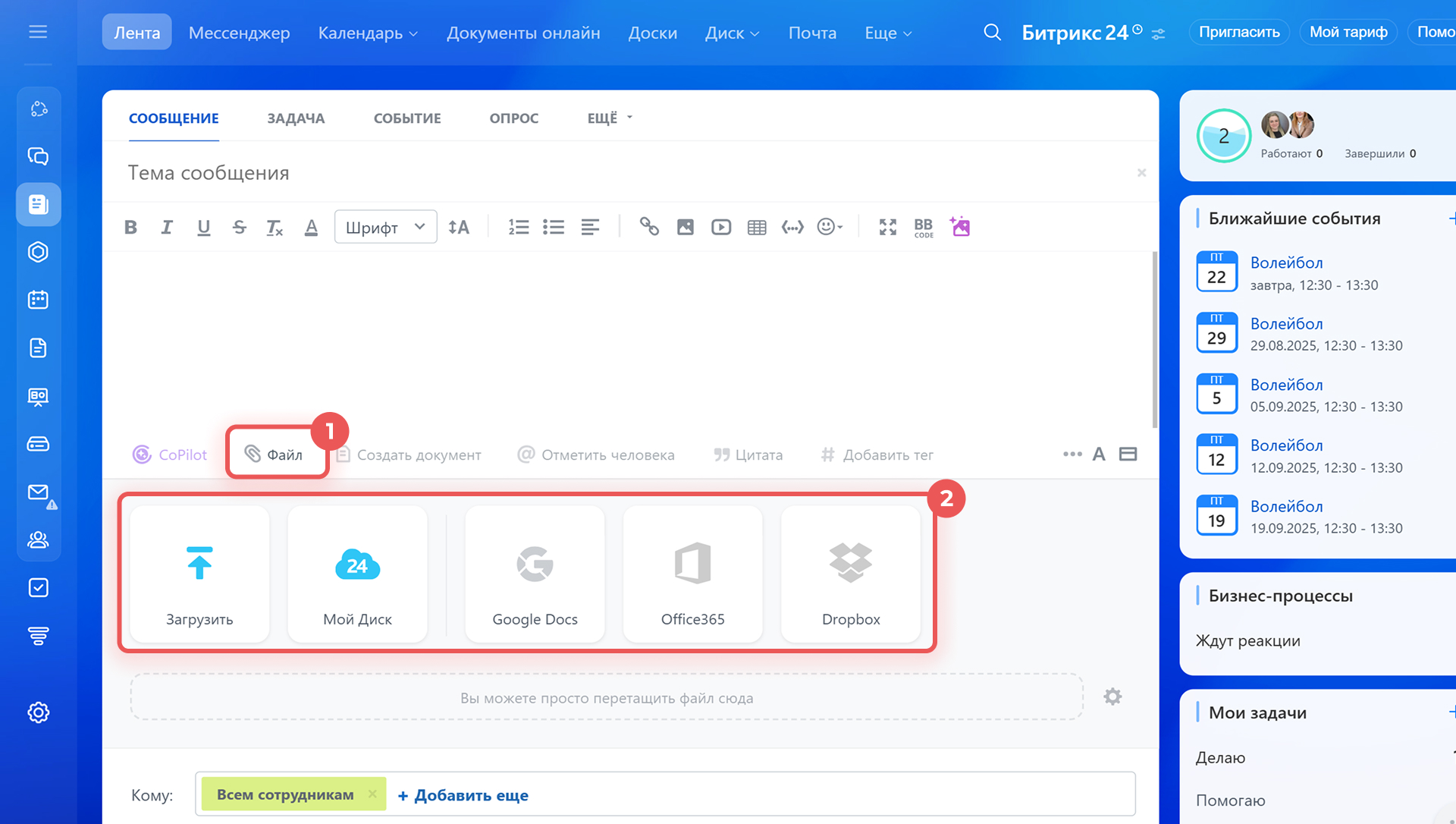 Прикрепить доску как файл. Добавьте доску в любой инструмент, где можно загружать файлы. Например, к задаче или сообщению в Ленте. Для этого нажмите Файл, выберите доску на Диске или загрузите ее с компьютера. Все участники задачи или сообщения автоматически получат доступ к редактированию.