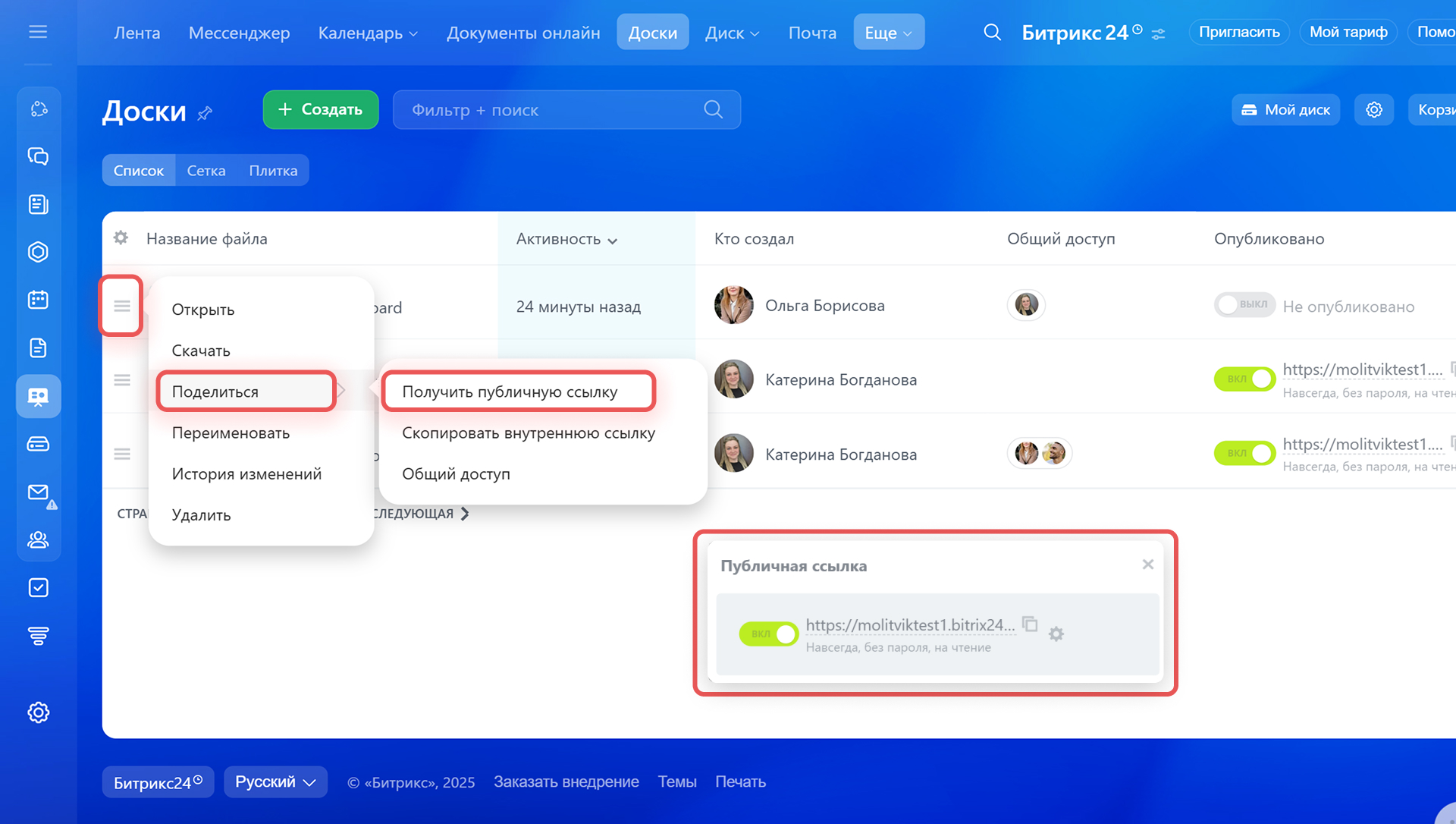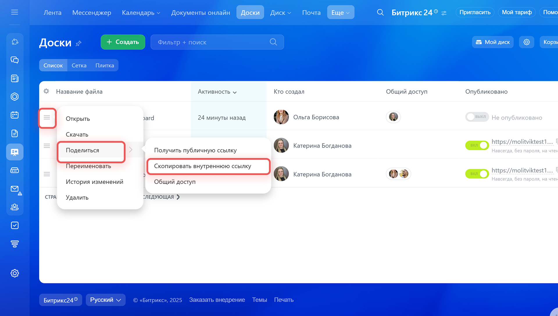 - Делиться досками можно с командой и внешними пользователями. Чтобы участники смогли просматривать и редактировать доску, отправьте коллегам внутреннюю ссылку, а клиентам — публичную ссылку.