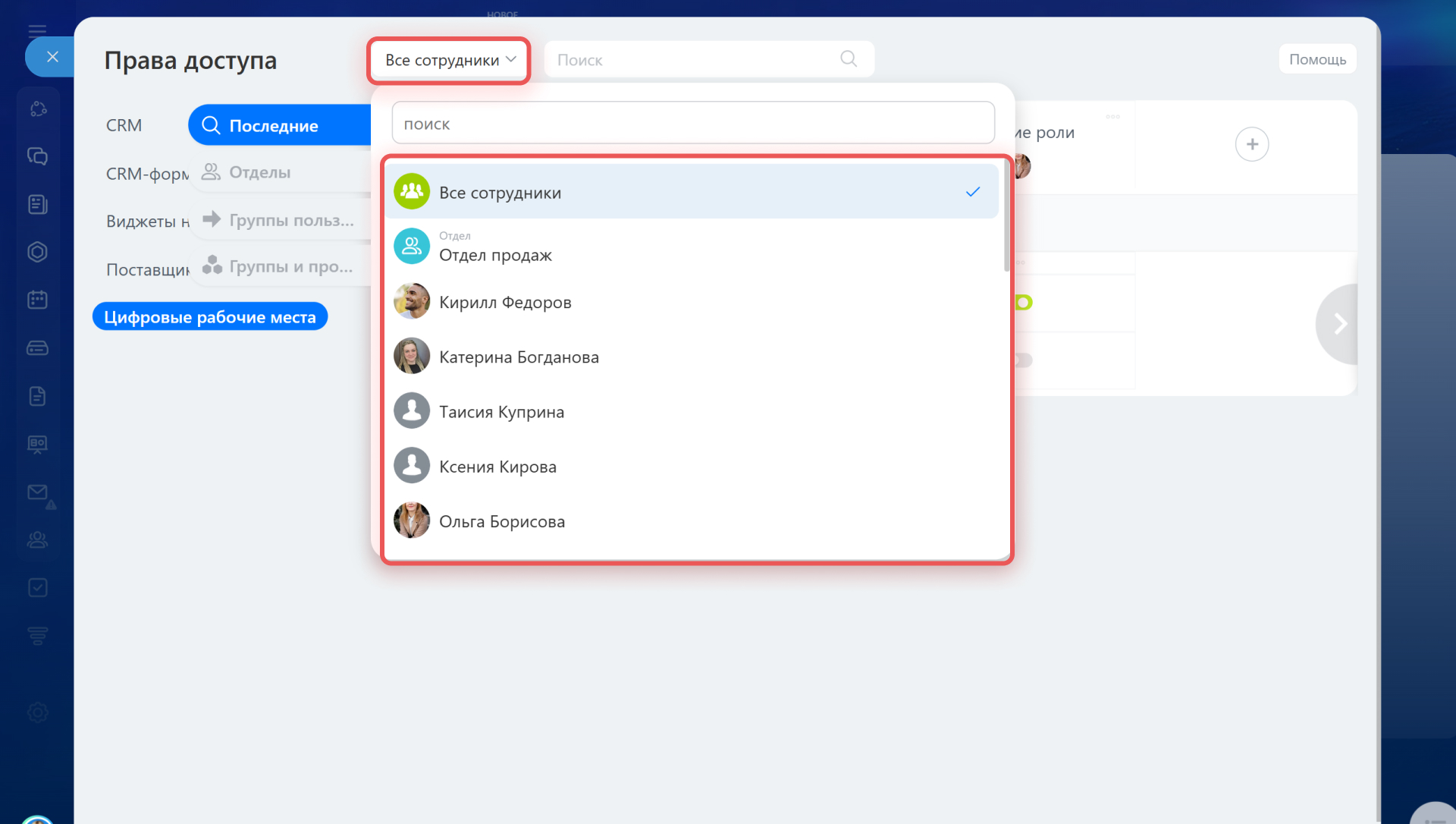 6. Выберите Цифровые рабочие места и укажите сотрудников, которые смогут создавать и настраивать рабочие места.