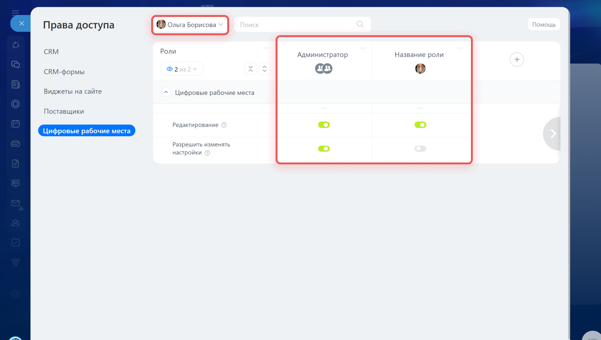 - Разрешить изменять настройки — возможность настраивать права доступа к цифровым рабочим местам.