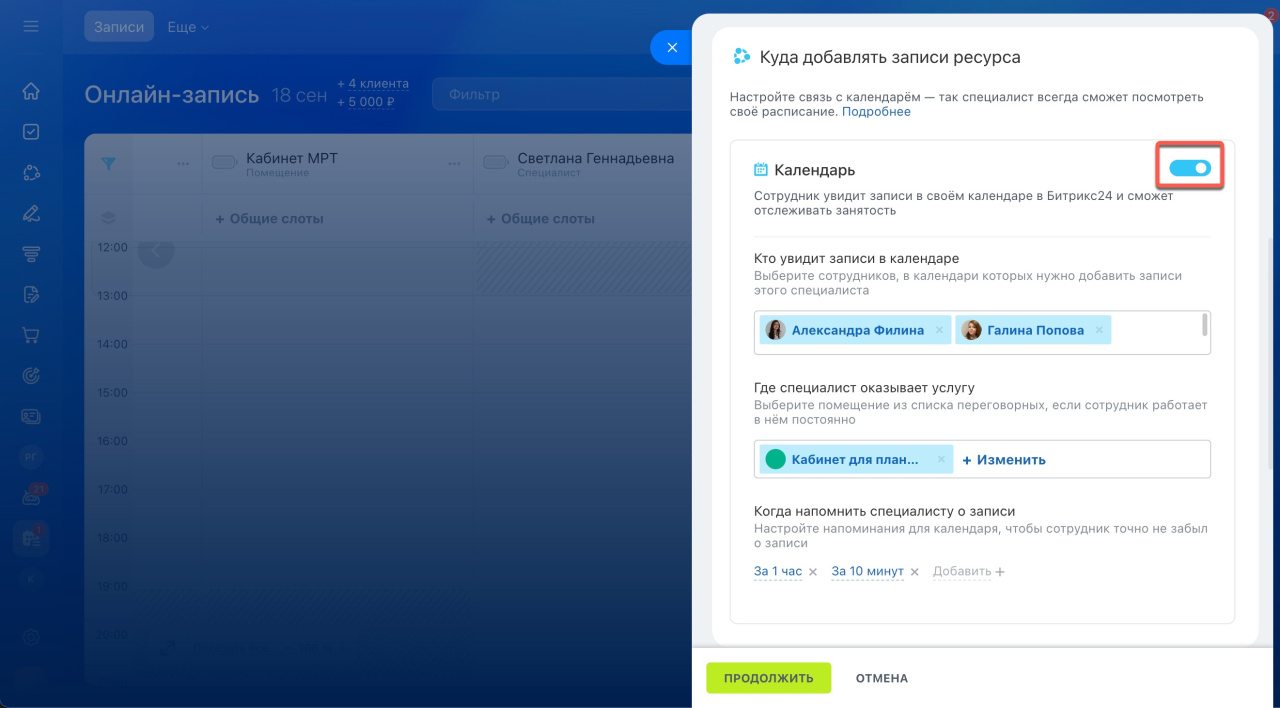 Куда добавлять записи ресурса. Включите опцию Календарь, чтобы связать онлайн-запись с календарем Битрикс24. Так все записи будут автоматически появляться в личных календарях сотрудников. Специалисты сразу видят свое расписание и не тратят время на поиск записей в разных местах. Настройте параметры: