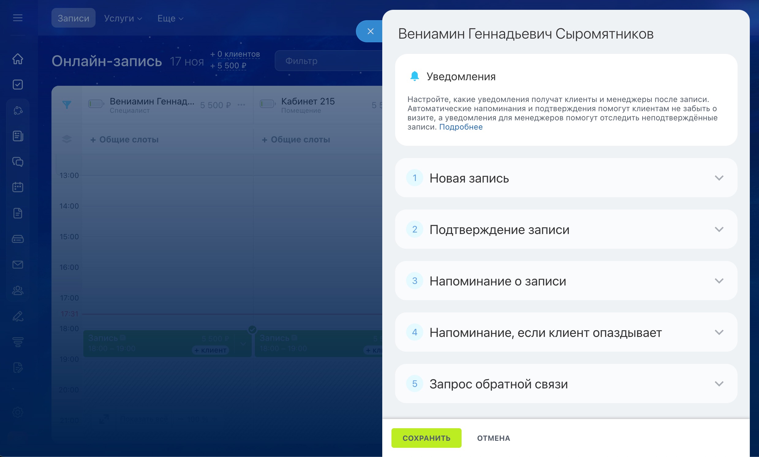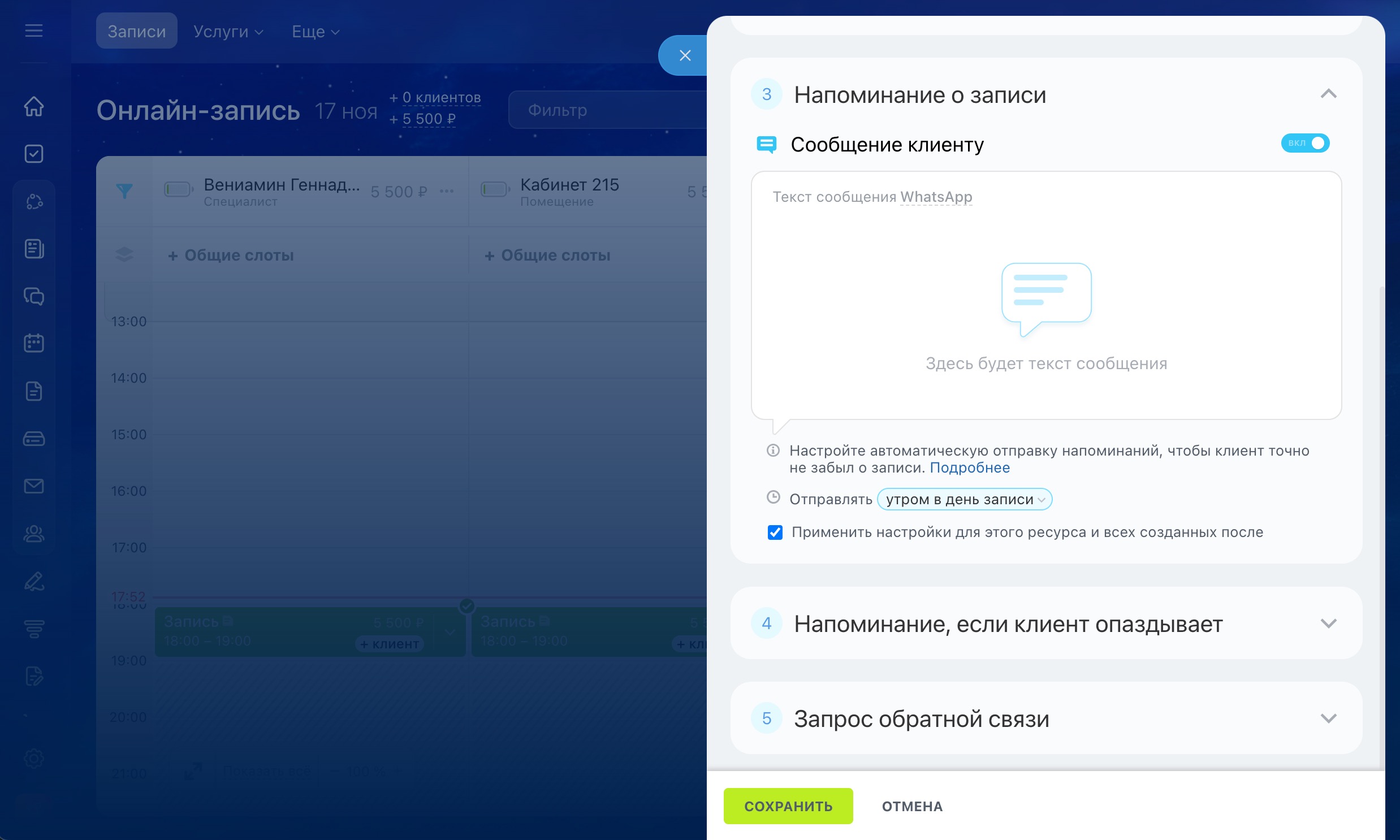 В разделе Онлайн-запись есть четыре вида автоматических сообщений: