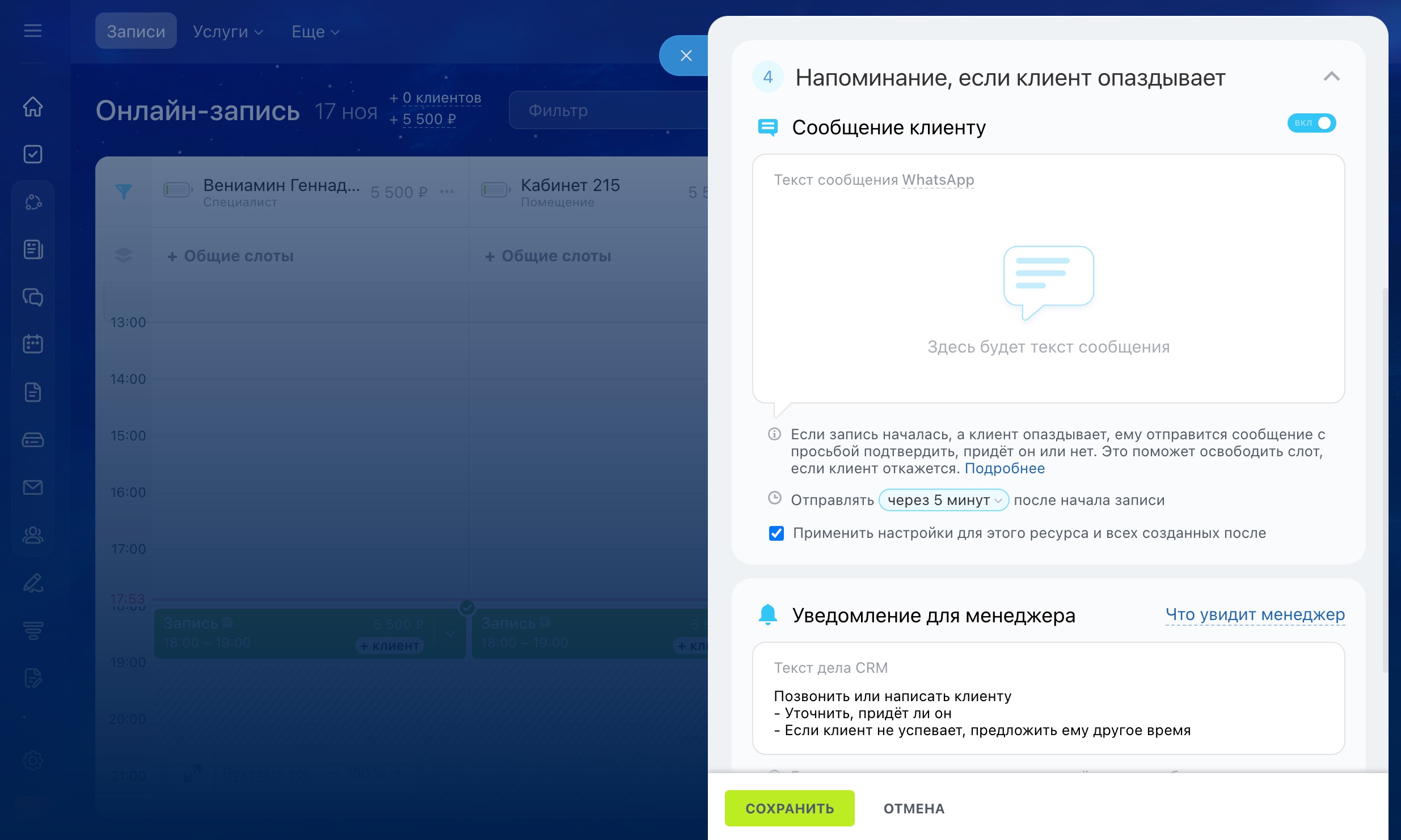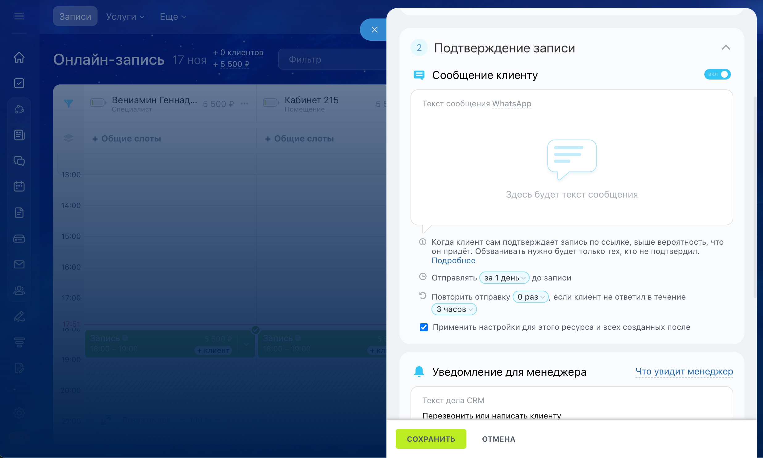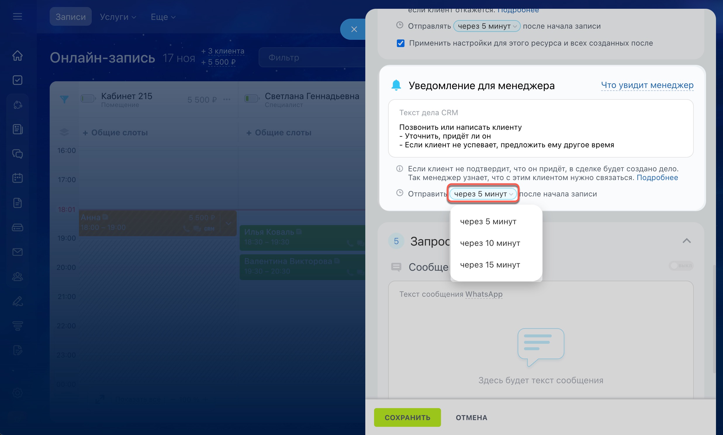 Уведомление для менеджера — если менеджер не подтвердил, что клиент пришел, в карточке CRM создается дело. Например, можно настроить отправку оповещения через пять минут после начала записи, чтобы менеджер связался с клиентом.