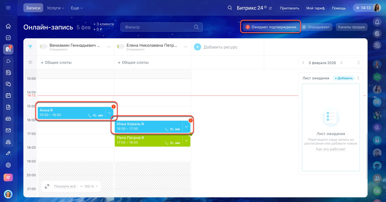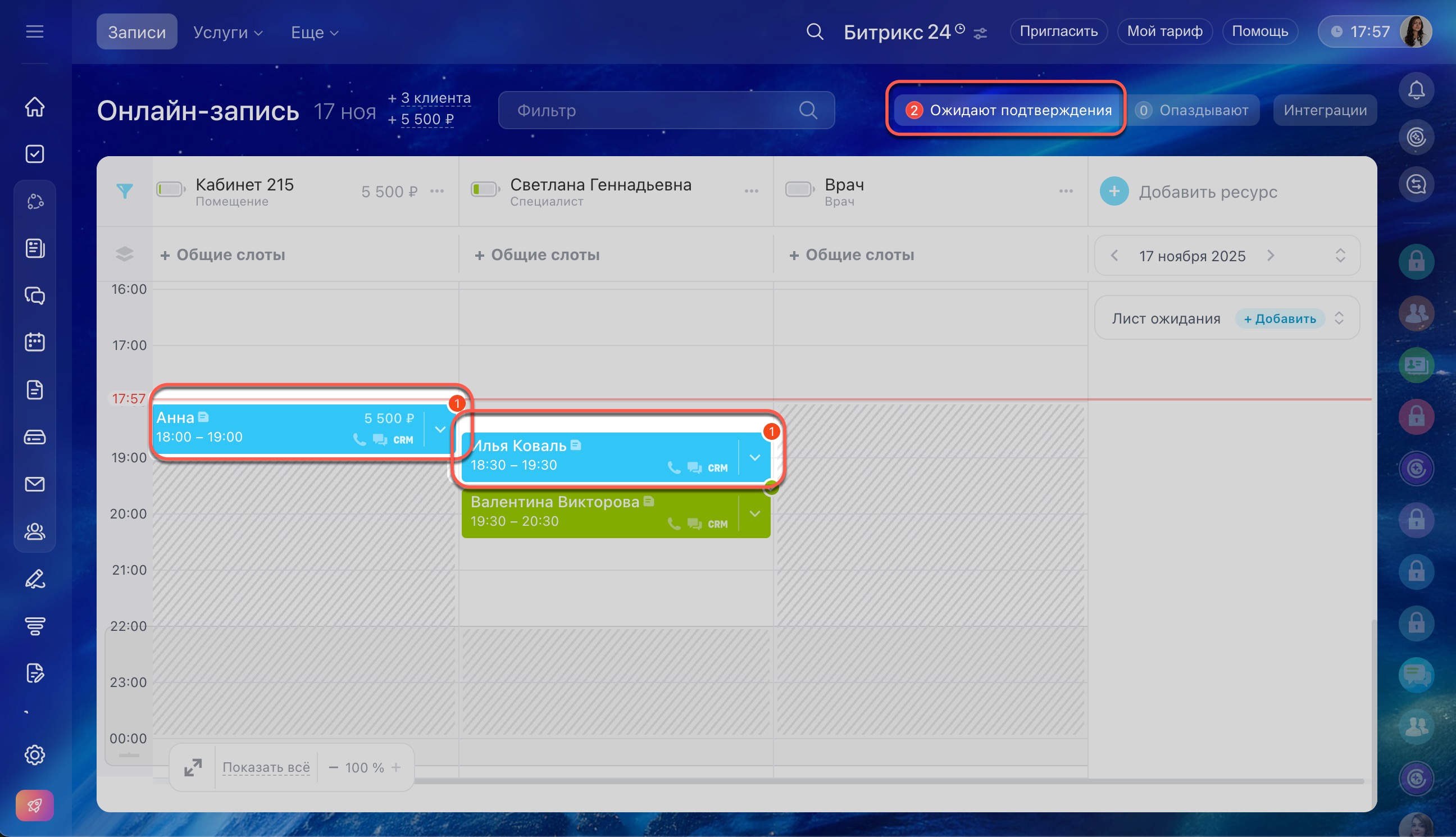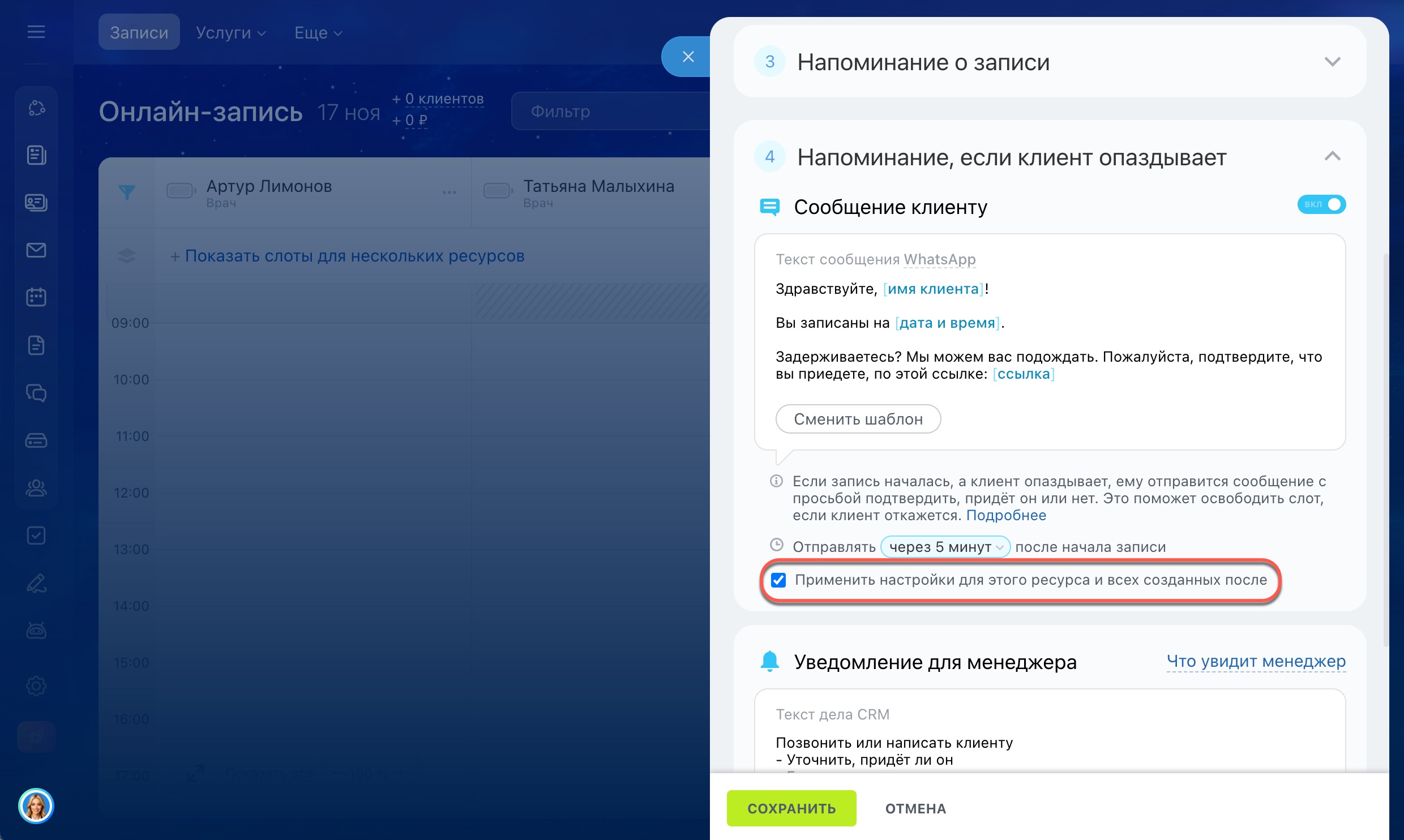 Уведомление для менеджера — если менеджер не подтвердил, что клиент пришел, в карточке CRM создается дело. Например, можно настроить отправку оповещения через пять минут после начала записи, чтобы менеджер связался с клиентом.