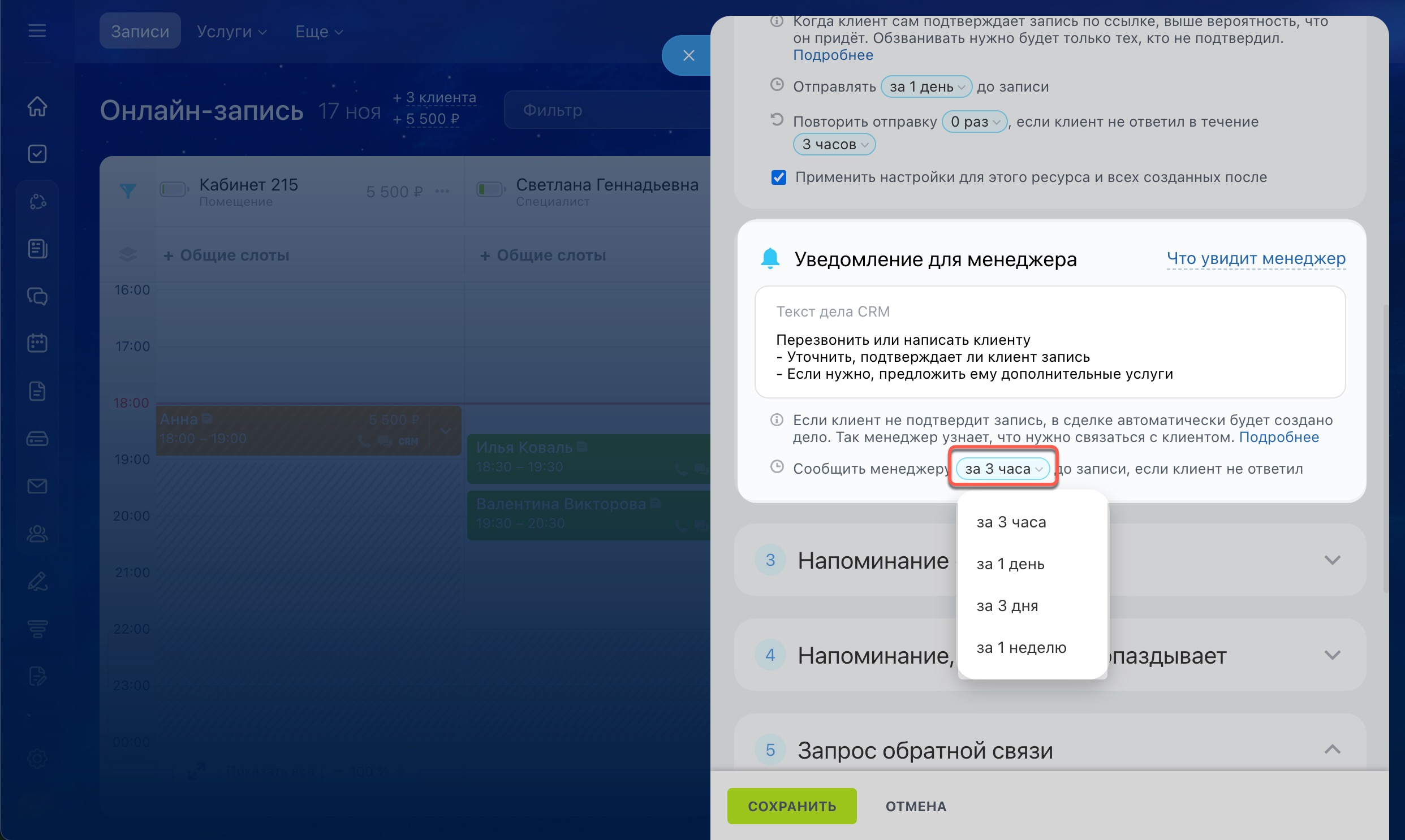Уведомление для менеджера — если клиент не подтвердит запись, в карточке CRM создастся дело для менеджера. Выберите, в какое время менеджер получит уведомление. Например, можно настроить отправку оповещения за три часа до записи, чтобы менеджер успел связаться с клиентом.