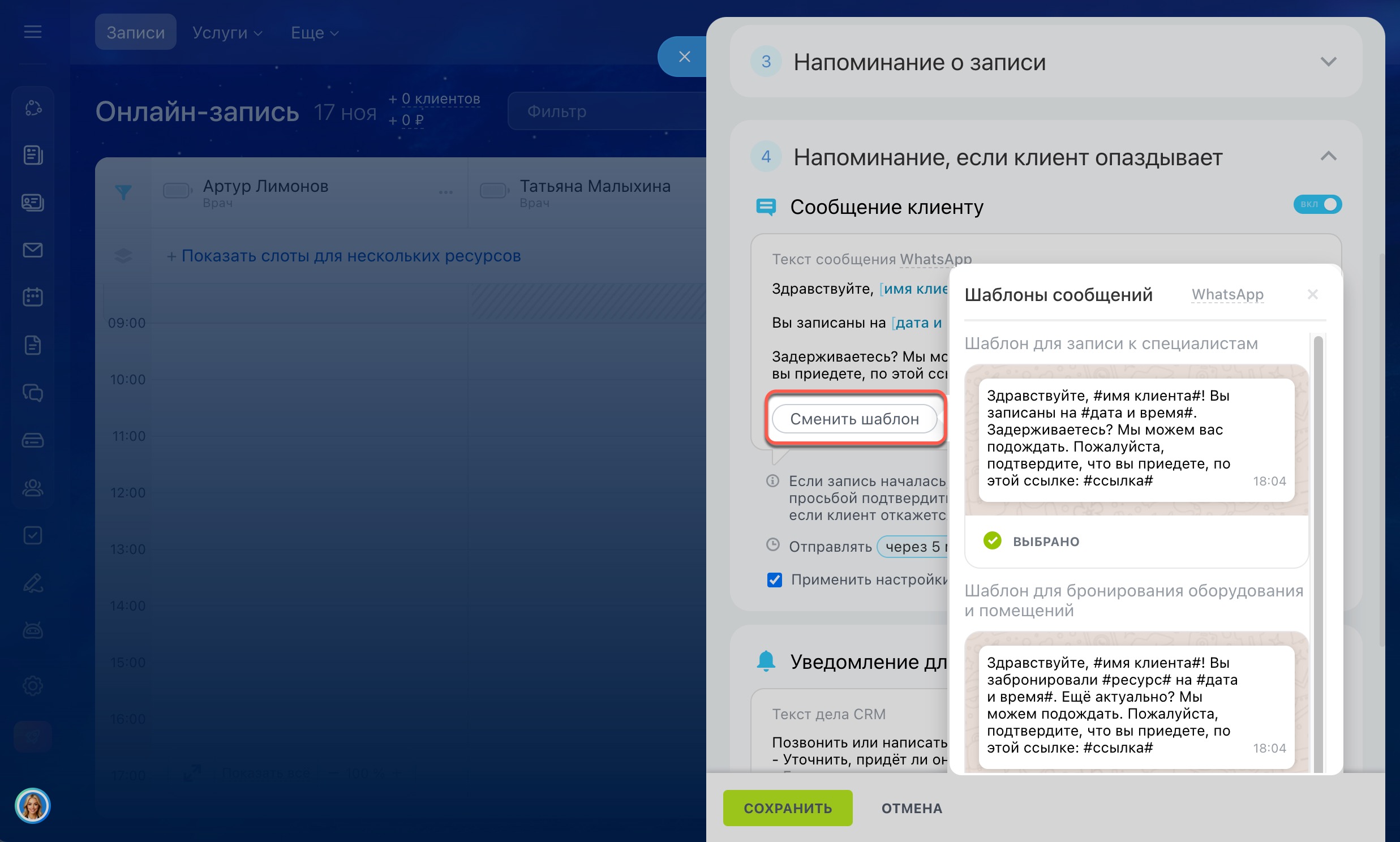 Например, если записываете клиента на прием к врачу, выберите шаблон для записи к специалистам. Нажмите Сменить шаблон > Выбрать сообщение.