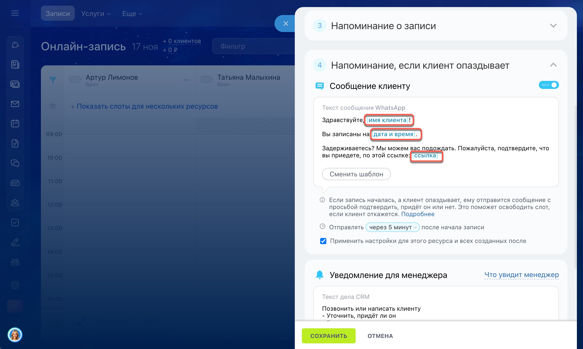 Напоминание, если клиент опаздывает. Если клиент задерживается, отправьте ему и менеджеру напоминание, чтобы подтвердить запись или освободить слот.