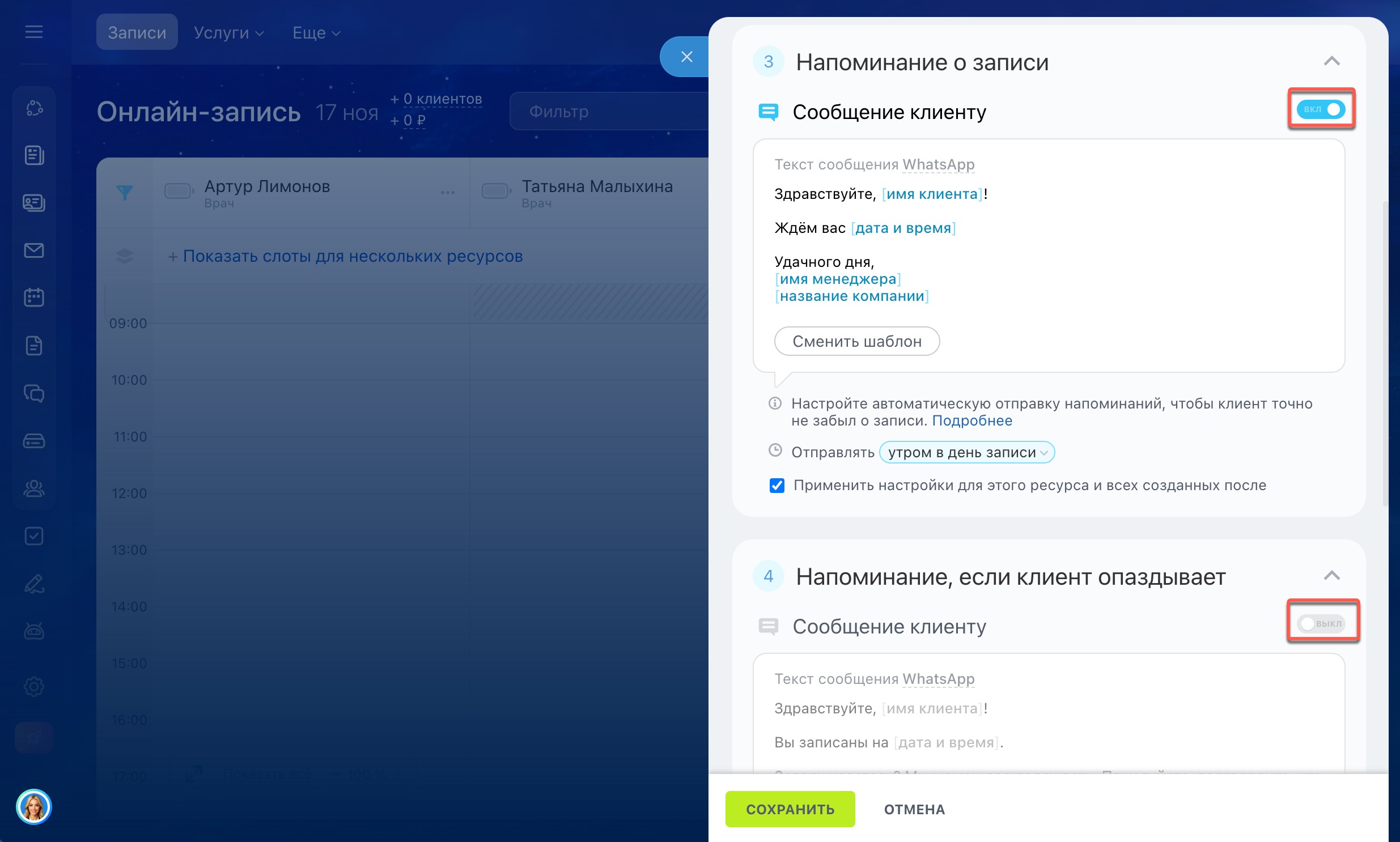 Напоминание о записи. Чтобы клиент не забыл о визите, настройте автоматическую отправку напоминаний. Выберите, когда клиент получит сообщение. Например, утром в день записи.