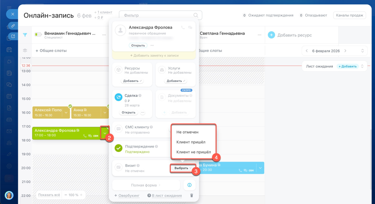 3-4. В блоке Визит кликните Выбрать, и выберите статус: клиент пришел или не пришел.