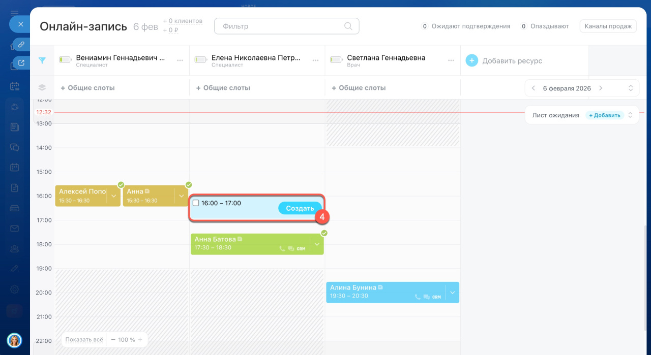 4. Выберите время под нужным ресурсомРесурсы — это люди, оборудование, помещения или техника, которые нужны для оказания услуг. Например, врачи, парикмахеры, автомобили, квартиры и так далее. и нажмите Создать.