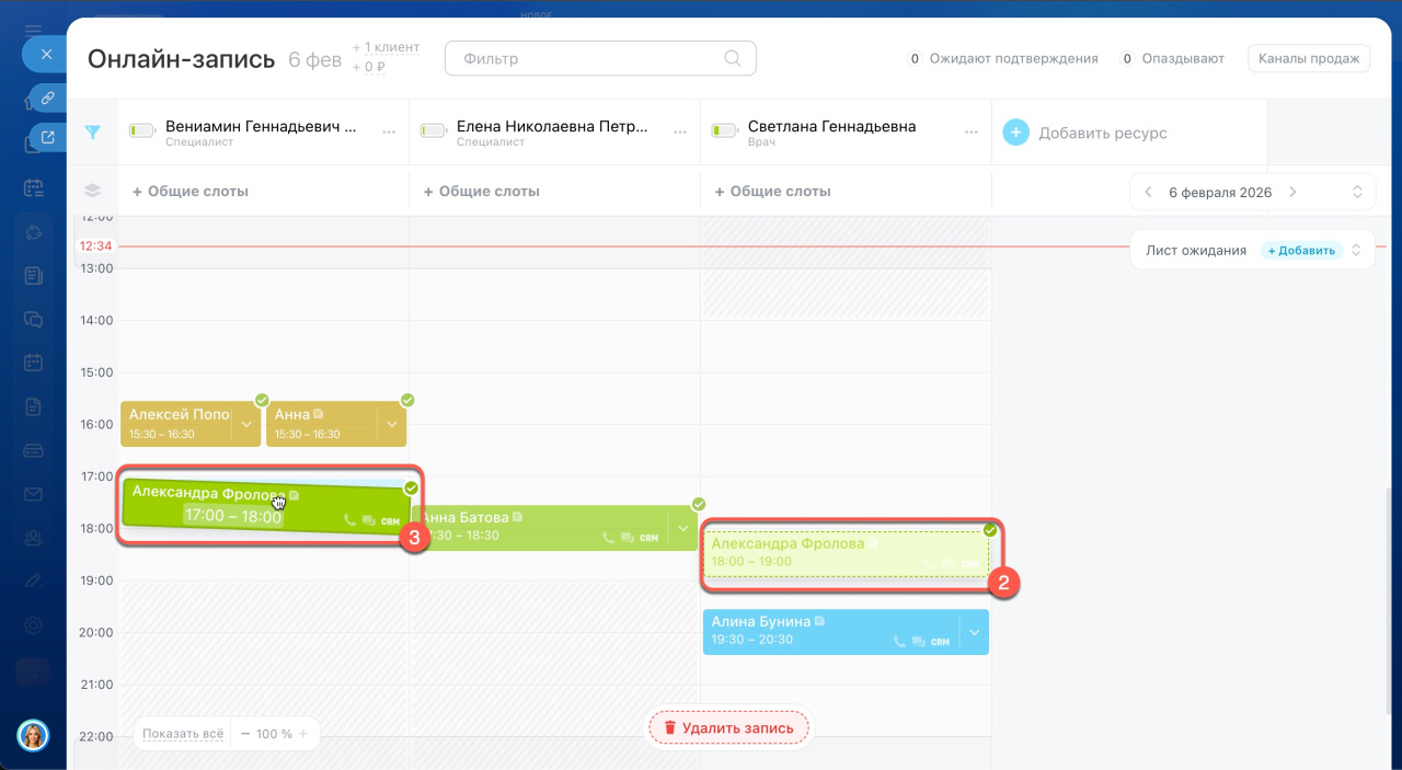 - Все данные о записи автоматически сохраняются в разделе Онлайн-запись и карточке CRM.