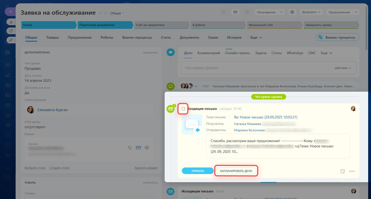 - Создать новое дело из входящего письма — если планируете продолжить работу с клиентом по этому письму.