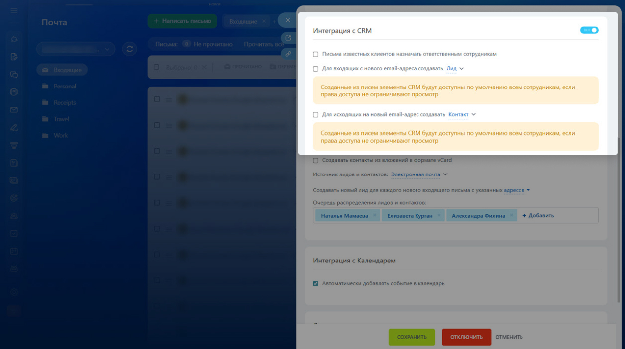 Если в настройках почтового ящика включена интеграция с CRM, лиды или сделки создаются автоматически.