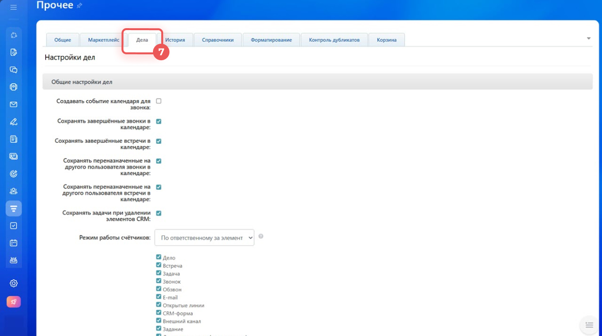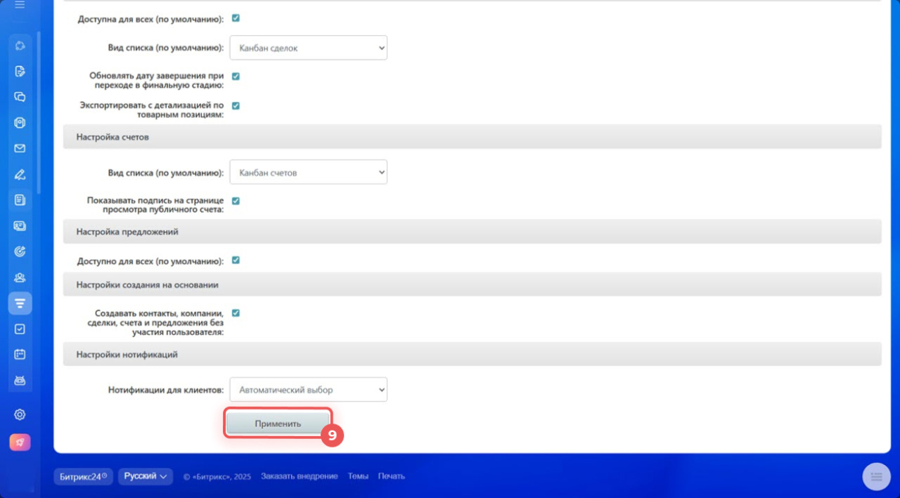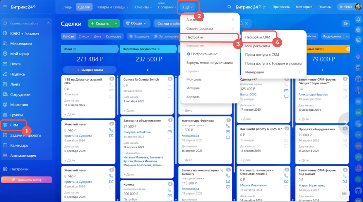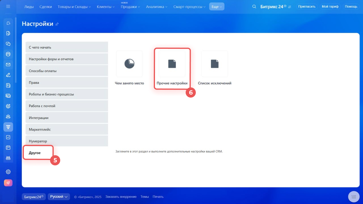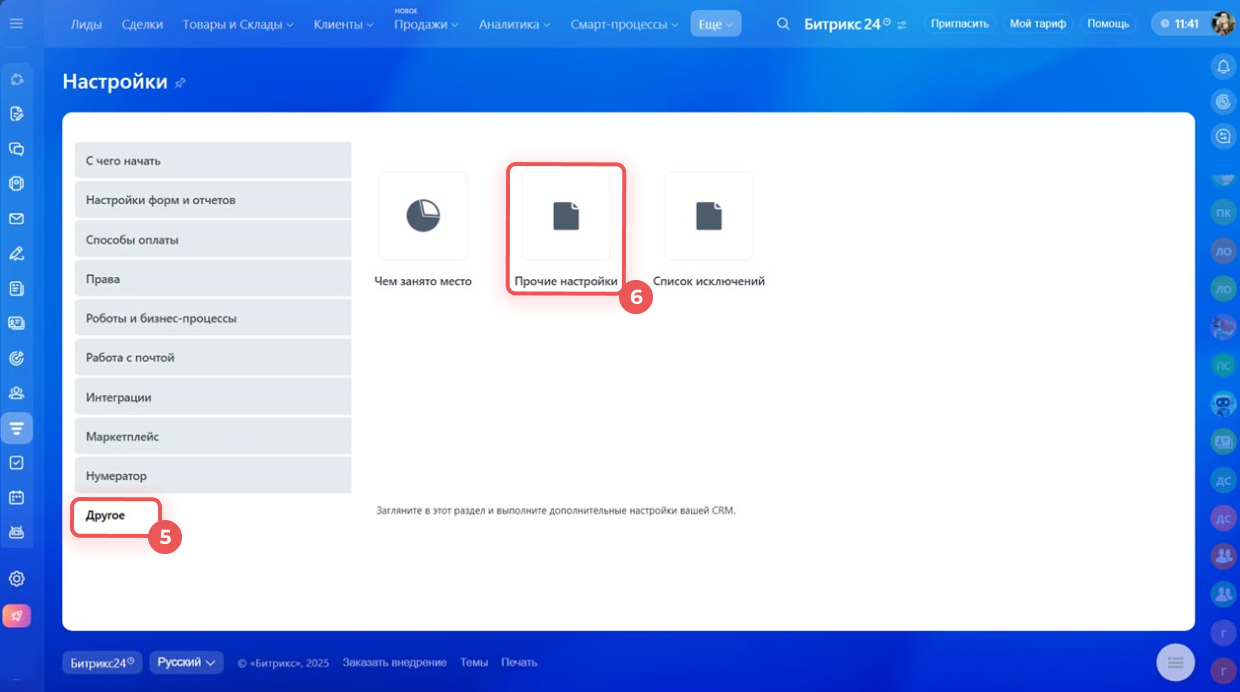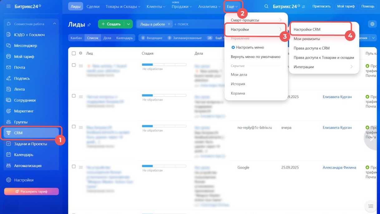 1–4. Перейдите в CRM > Еще > Настройки > Настройки CRM.