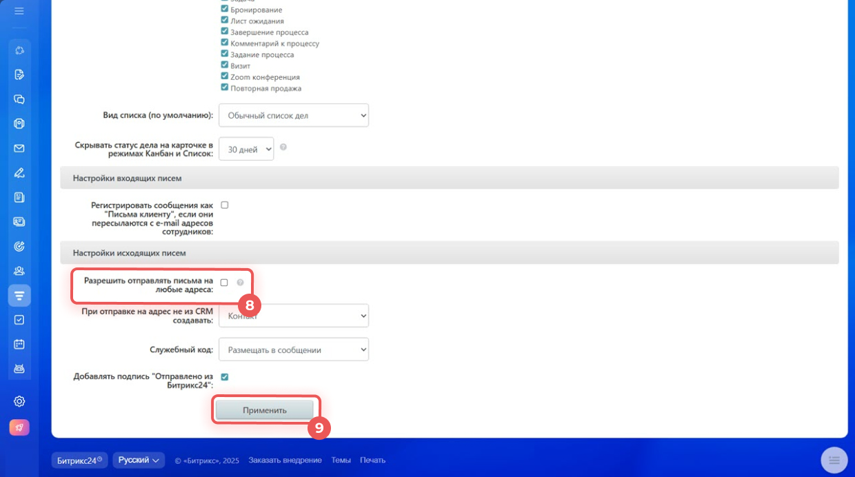 8–9. Снимите галочку Разрешить отправлять письма на любые адреса и нажмите Применить.