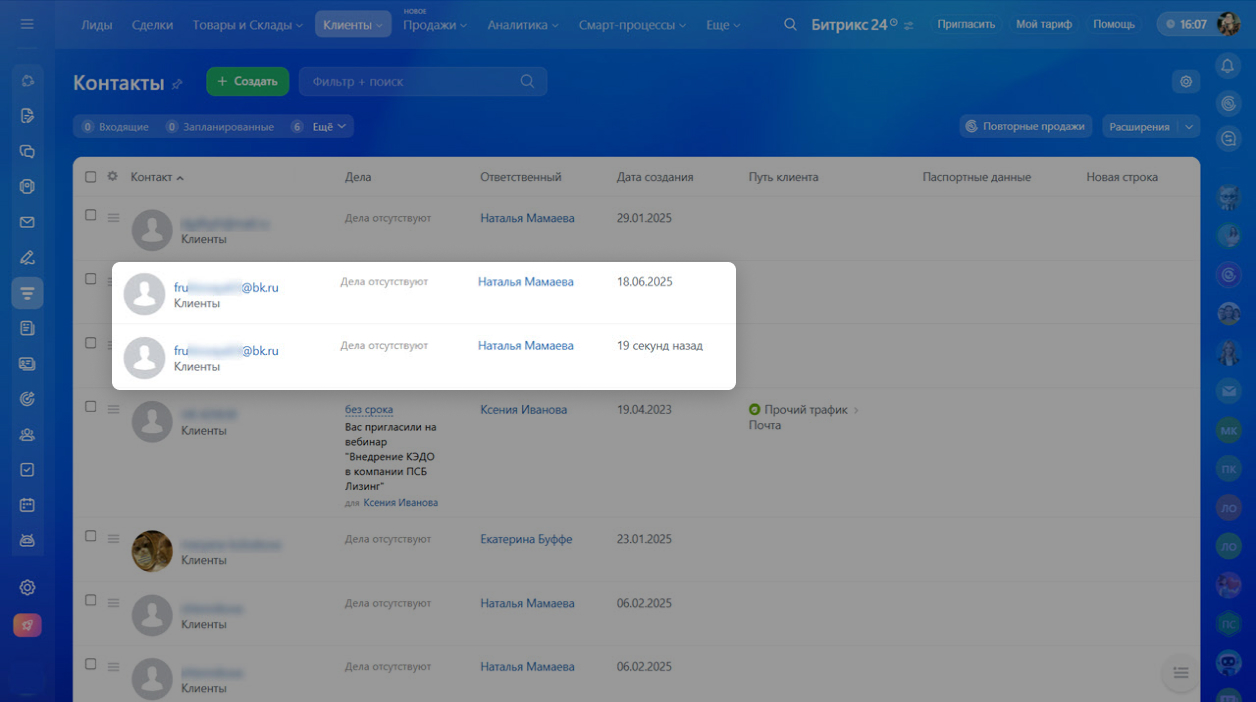 Дубли создаются, если вы отправляете письмо на e-mail из адресной книги — он отмечен синей иконкой . В этом случае CRM воспринимает адрес как новый и создает дубль, даже если такой e-mail уже есть в другой карточке.