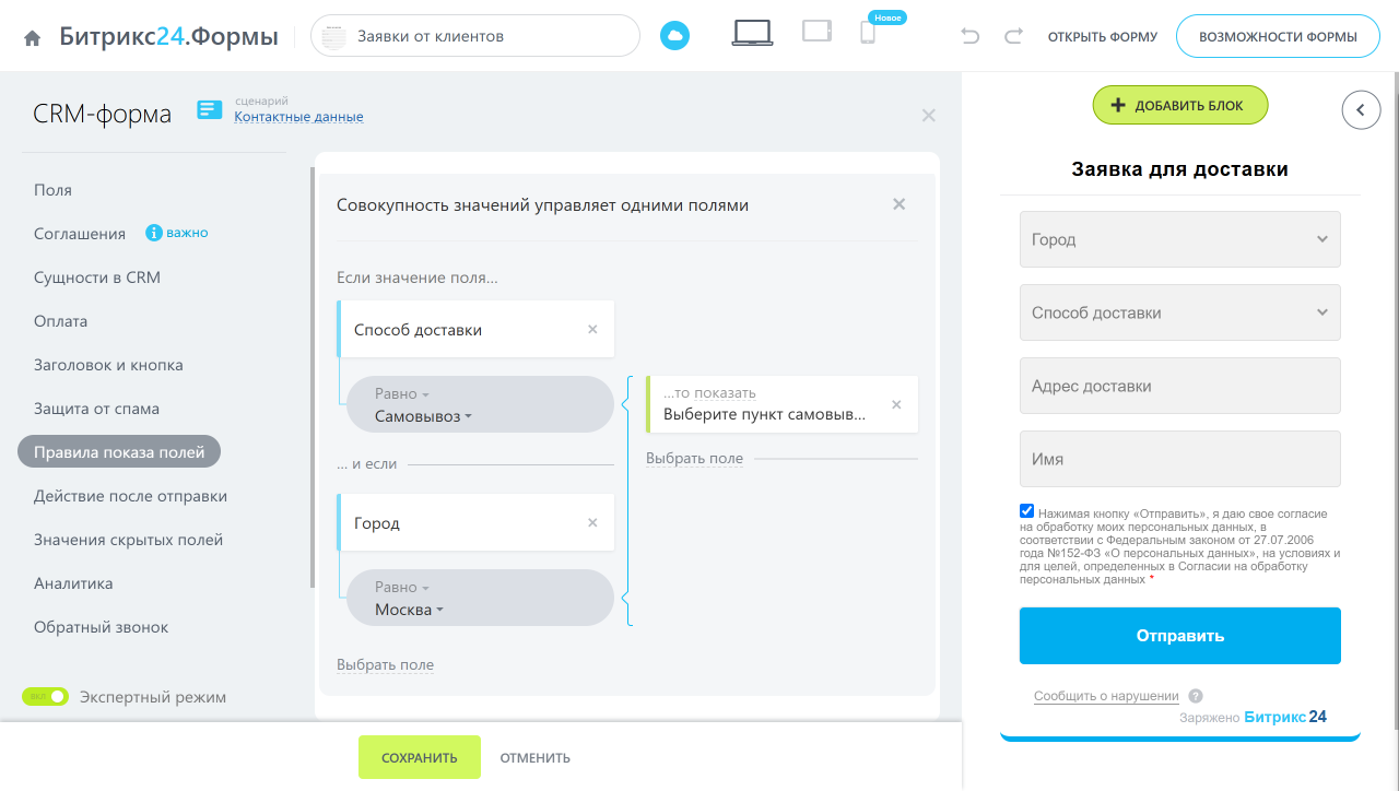 При такой настройке правил поле «Выберите пункт самовывоза» появится в CRM-форме, только если в поле «Город» выбрать значение «Воронеж». Если выбрать значение «Москва», поле «Выберите пункт самовывоза» будет скрыто.