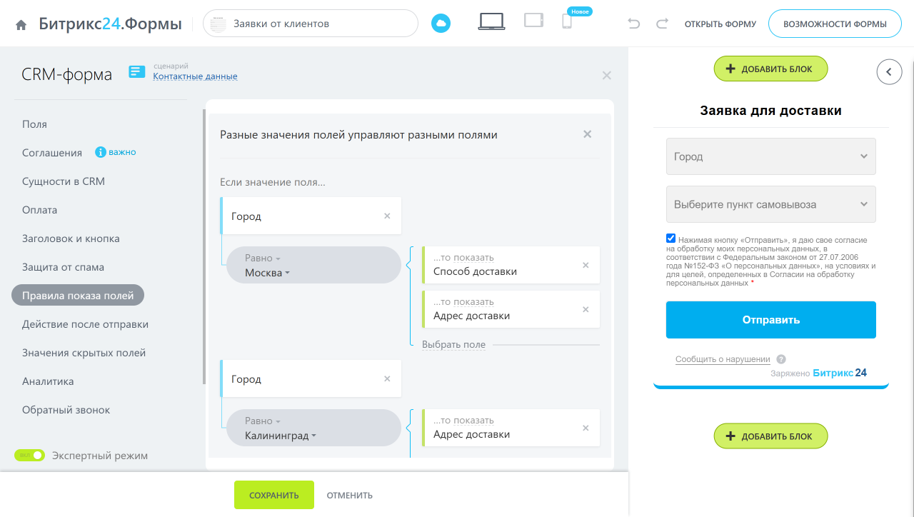 При такой настройке правила поле «Адрес доставки» появится в CRM-форме, только если в поле «Город» выбрать значение «Калининград». Если выбрать значение «Москва», поле «Адрес доставки» будет скрыто.