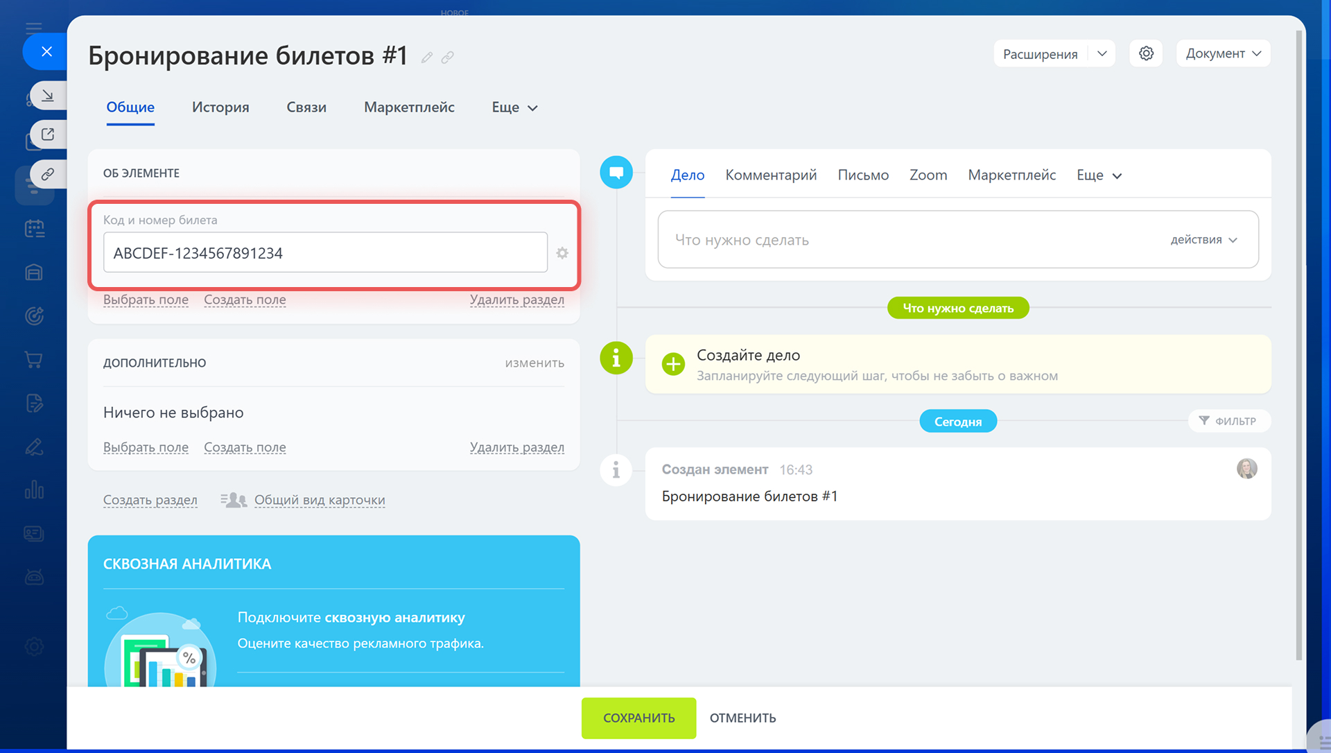 - В поле должен быть указан код бронирования и номер билета.