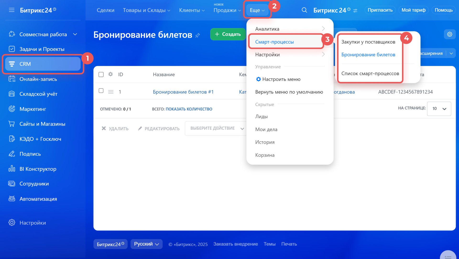1-4. Перейдите в CRM > Еще > Смарт-процессы и выберите нужный смарт-процесс.