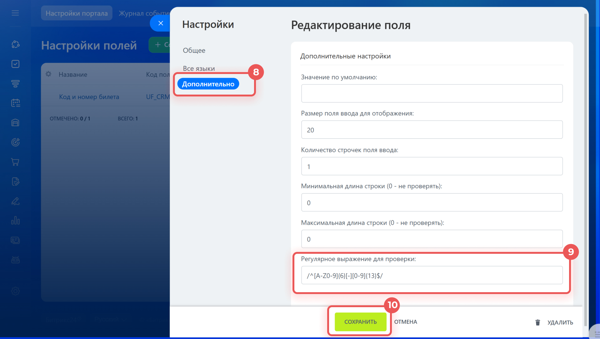 - Чтобы добавить регулярное выражение в поле смарт-процесса, перейдите в CRM > Еще > Смарт-процессы и выберите нужный смарт-процесс. Нажмите Настройки (⚙️) > Настройки полей. Выбери поле, откройте вкладку Дополнительно и добавьте выражение в поле Регулярное выражение для проверки.