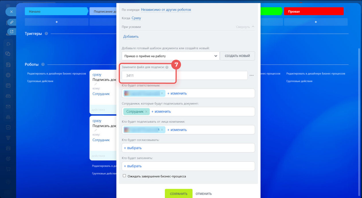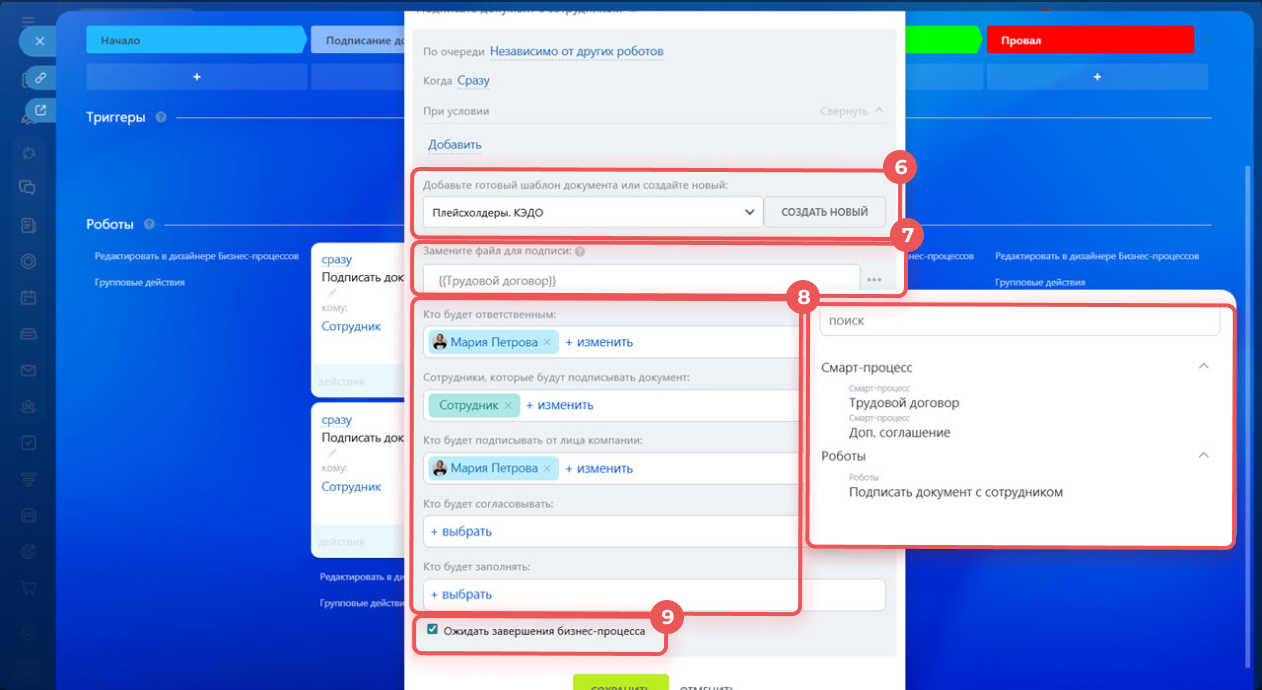 - Настроить роботов и триггеры — автоматически отправлять сотрудникам документы и отслеживать их подписание.