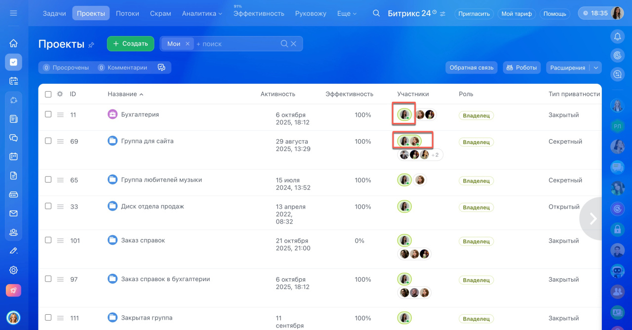 Администратор Битрикс24 сможет просматривать и управлять всеми группами и проектами, если включит Режим администратора.