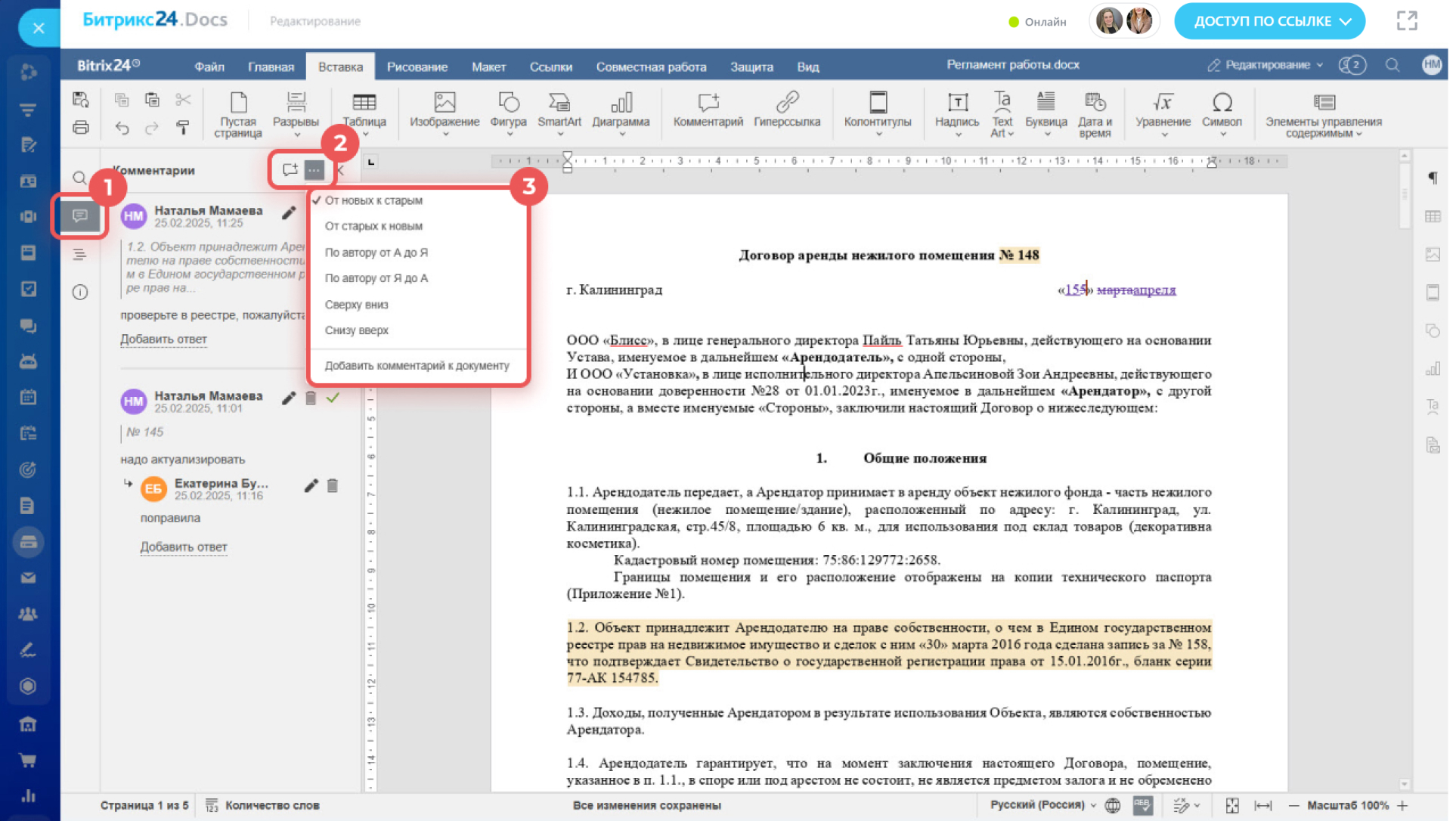 Вы можете просмотреть изменения, отсортировать комментарии или добавить новые. Нажмите Комментарии > Три точки (...) и выберите нужный вариант.