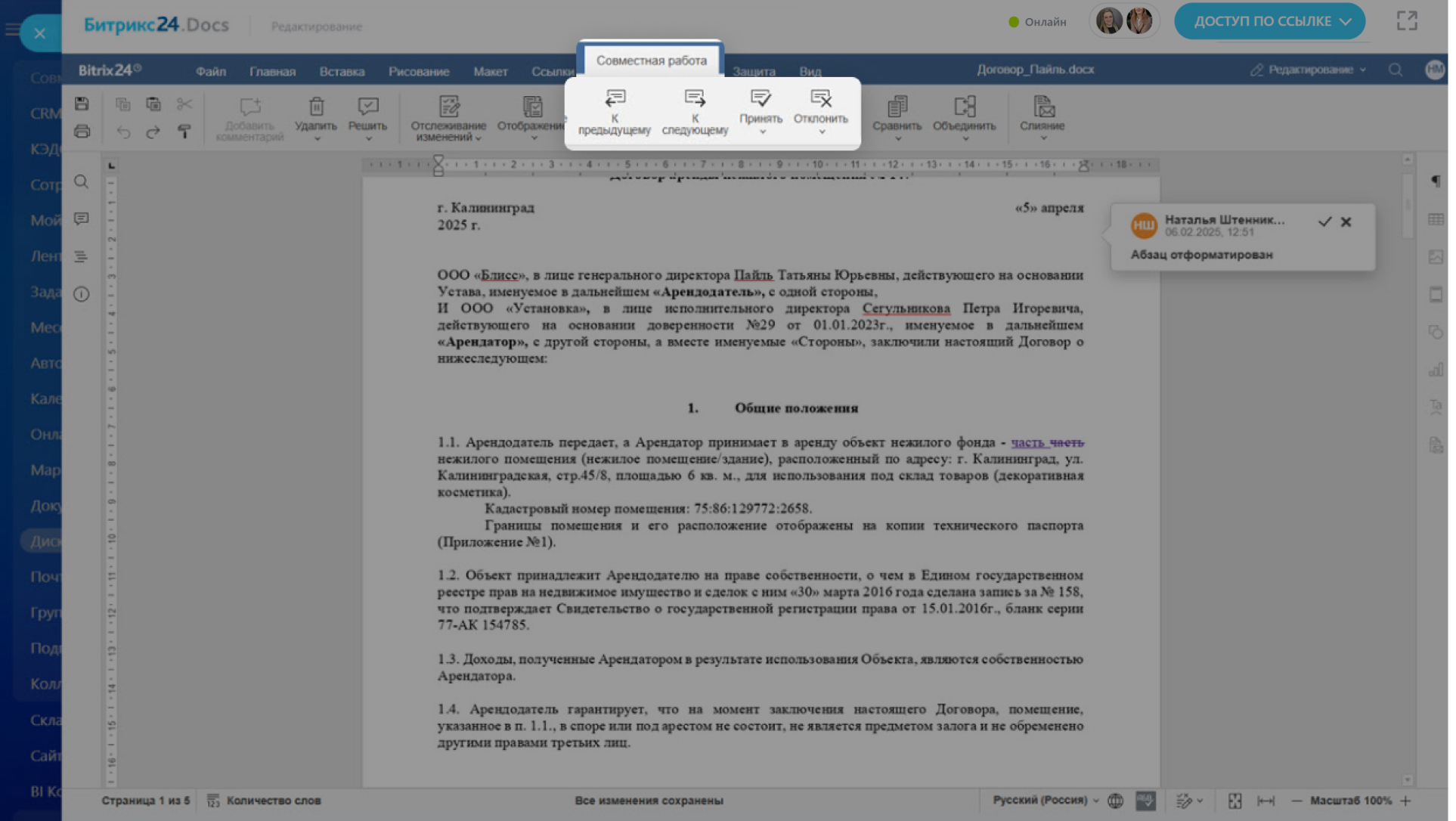 Чтобы быстро переключаться между комментариями и правками, отклонять или принимать их, используйте вкладку Совместная работа.
