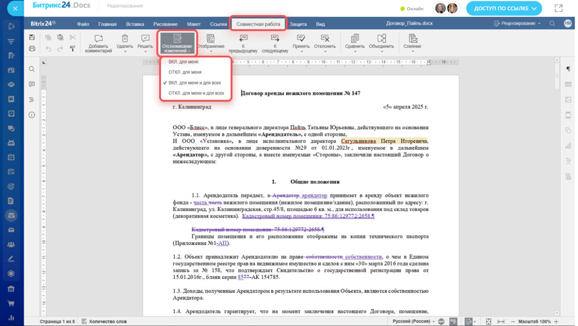 - Для всех — правки увидят все сотрудники. Если один из сотрудников включит отслеживание, этот режим автоматически применится для всех сотрудников.