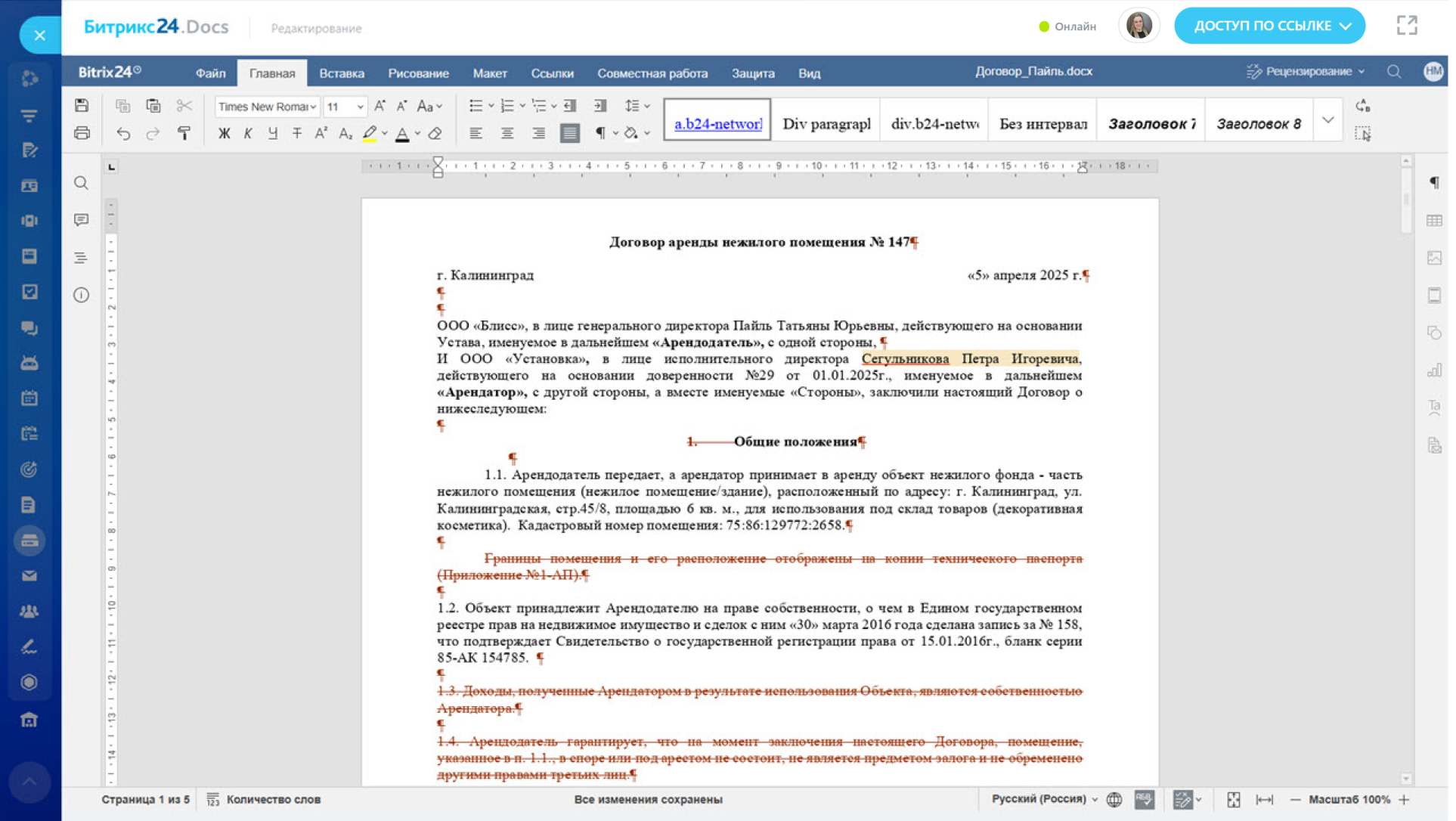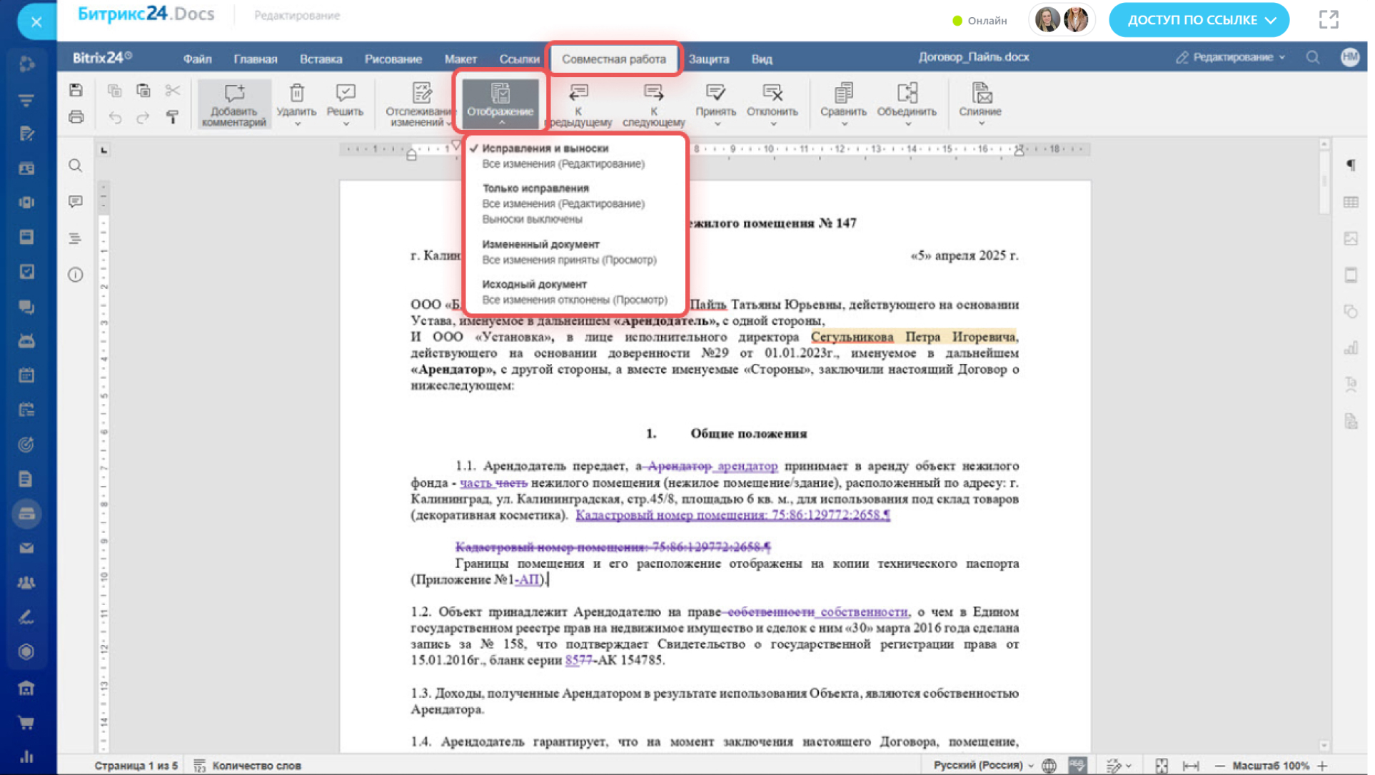 - Измененный документ — показывает, как будет выглядеть документ после принятия всех правок.