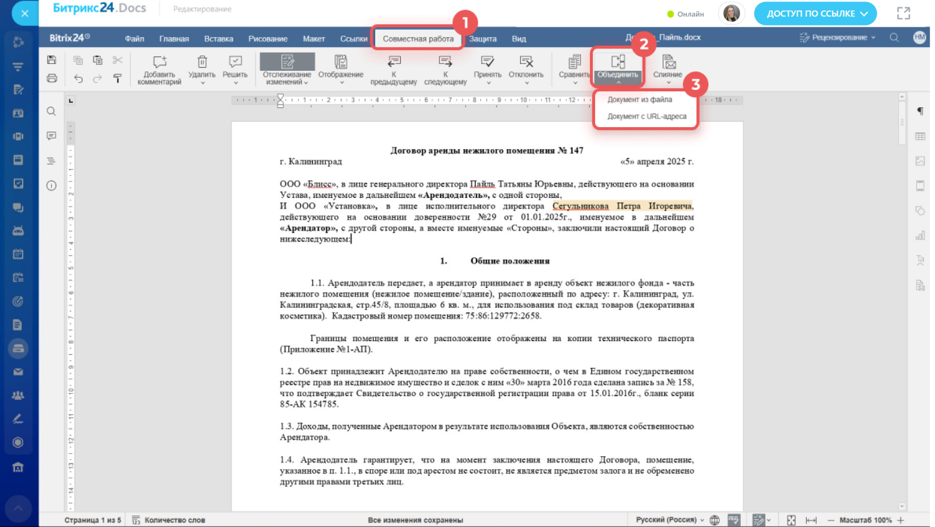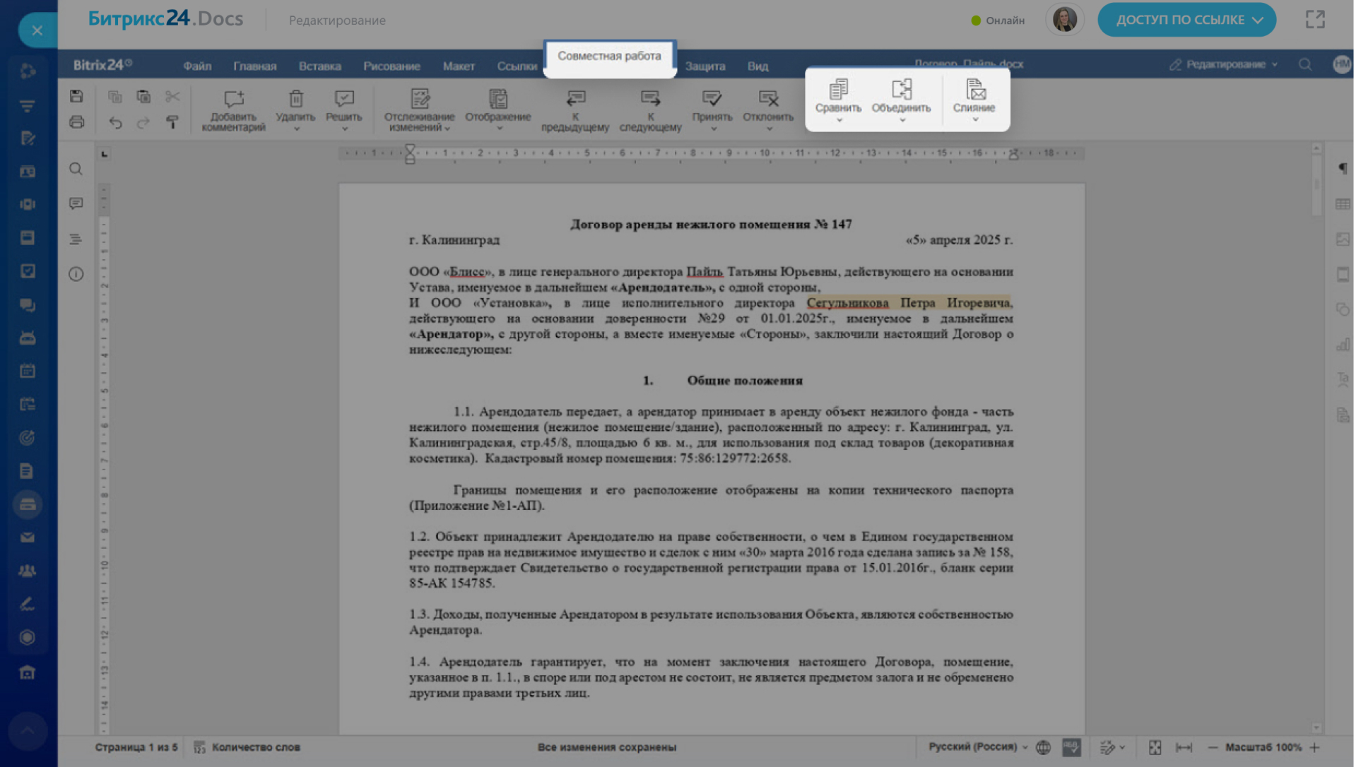 - Слияние — помогает объединить изменения, если несколько сотрудников редактировали документ одновременно. Можно принять или отклонить каждое исправление.