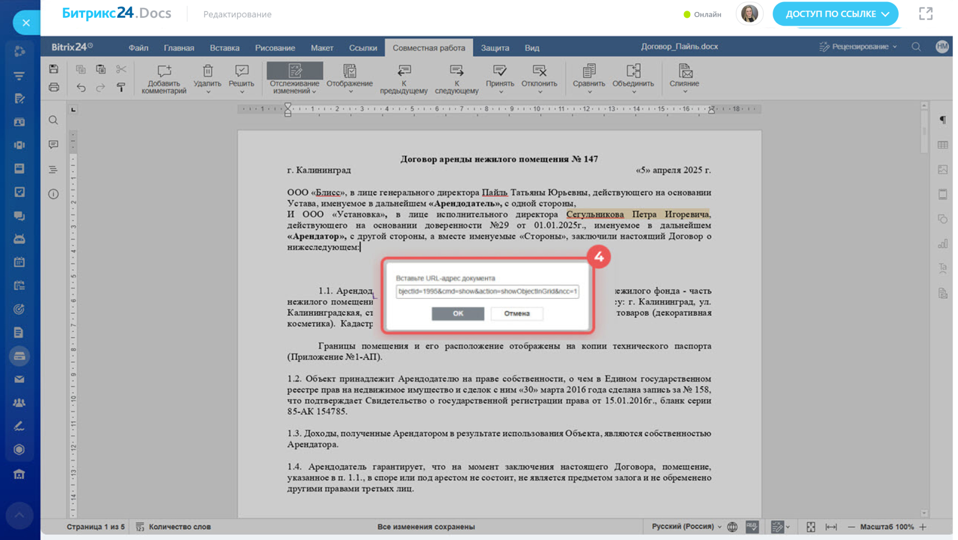 1-3. Нажмите Совместная работа > Объединить > Документ с URL-адреса. Это документ, который хранится на диске в Битрикс24, и доступен по ссылке.