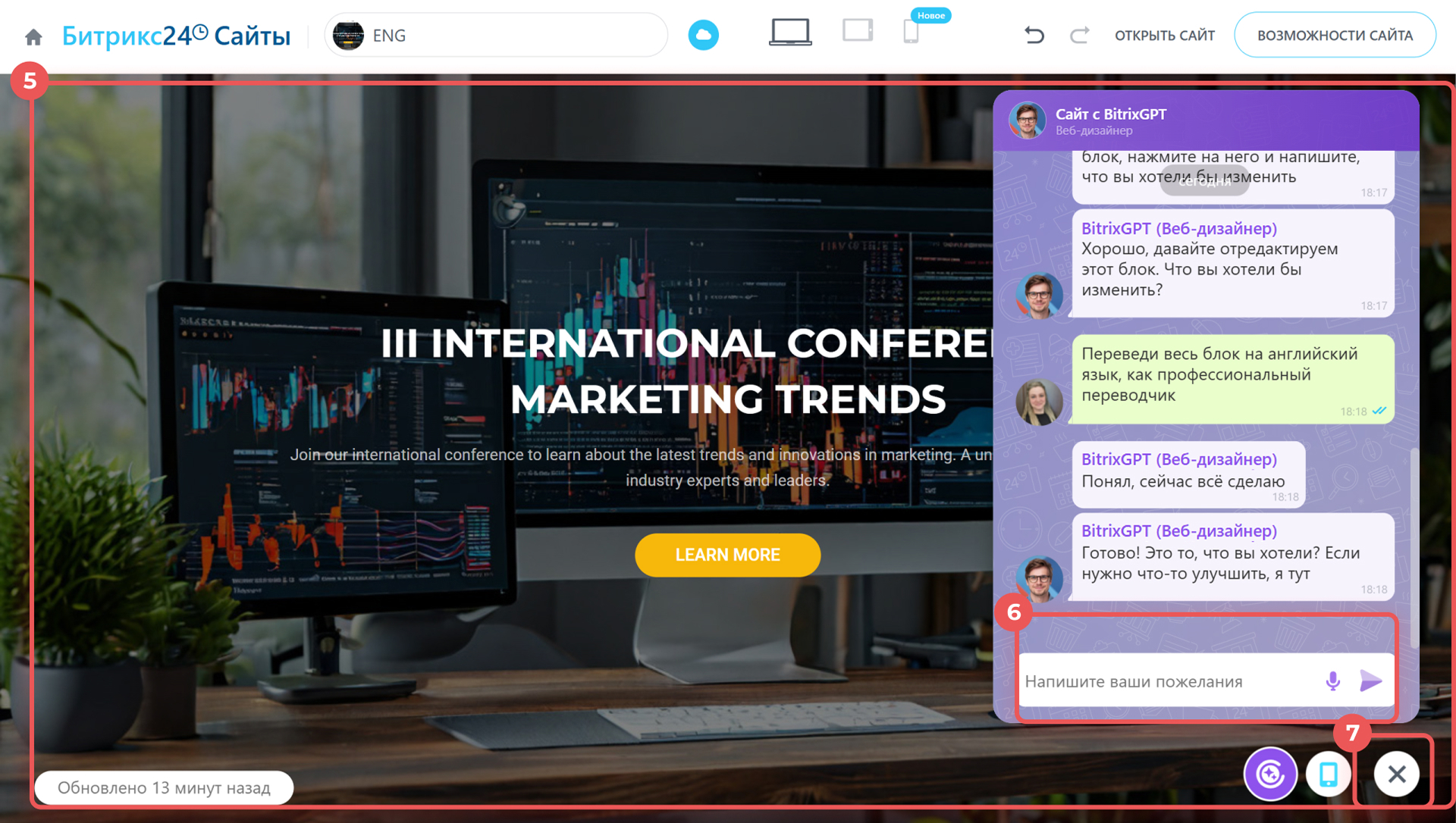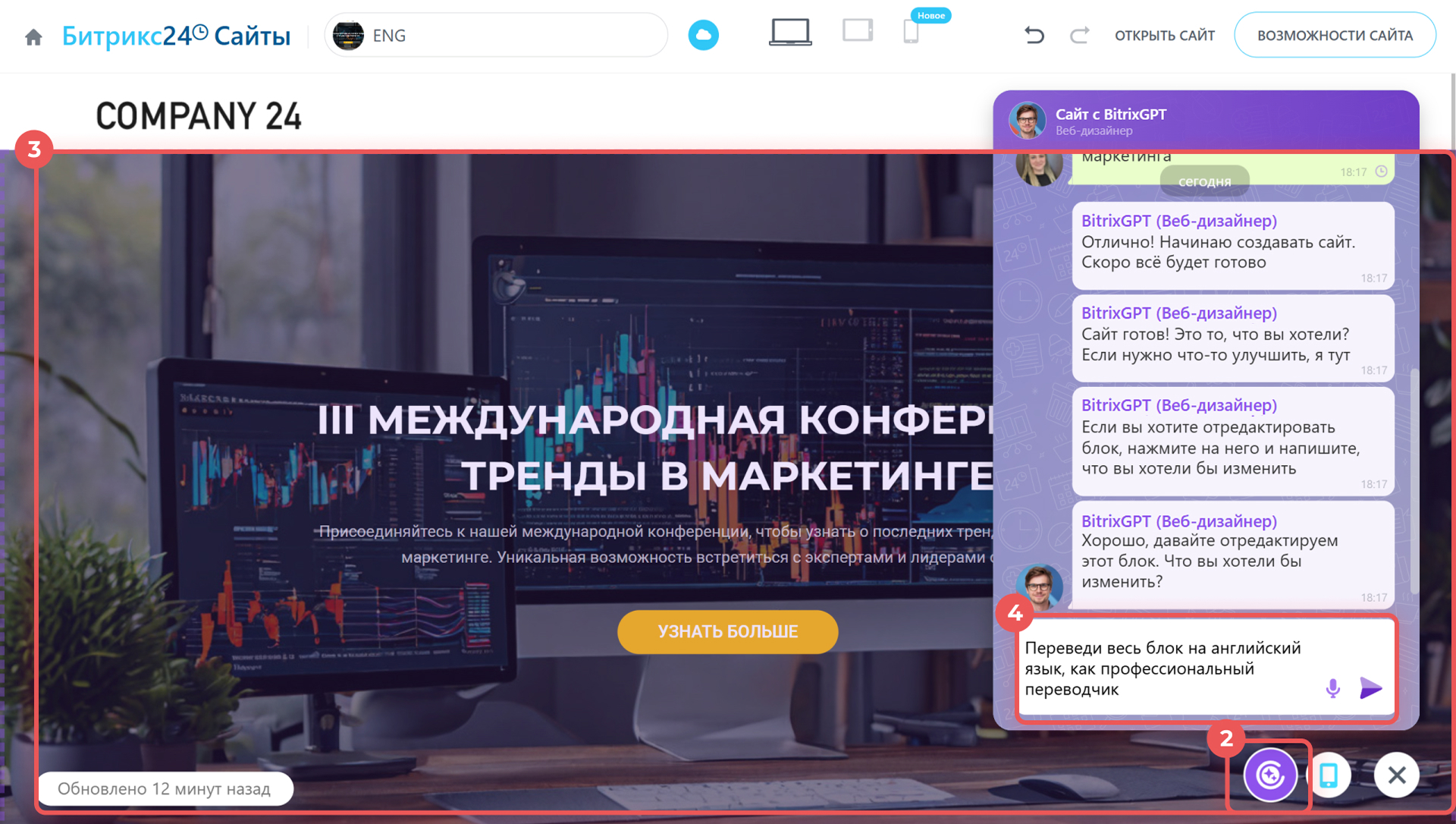 3. Кликните на блок, который нужно перевести — он подсветится сиреневым цветом. Если BitrixGPT не сможет отредактировать блок, то напишет об этом в чате.