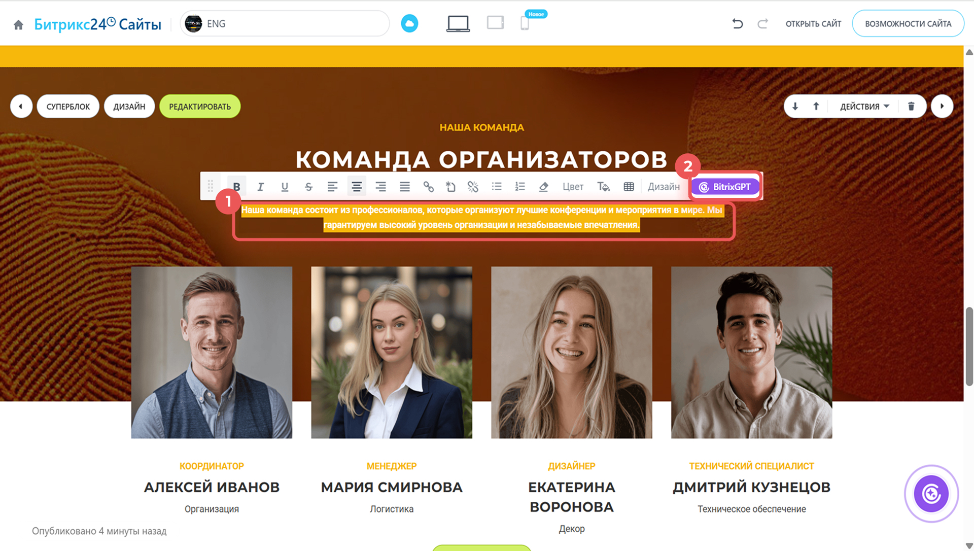 1–2. Выделите нужный текст в блоке и нажмите кнопку BitrixGPT.