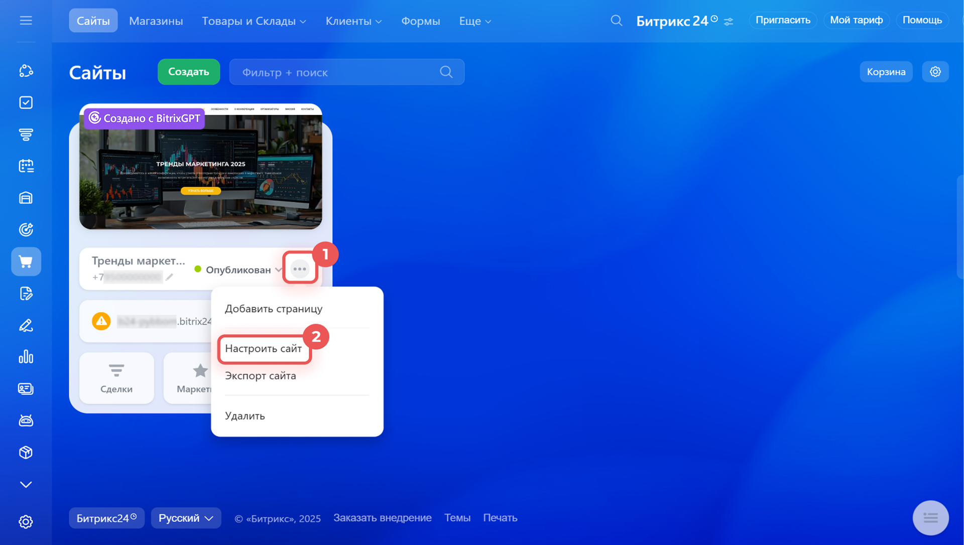 1–2. Перейдите в раздел Сайты и Магазины > Сайты.
