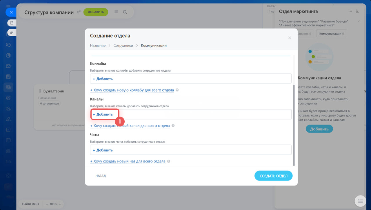 - В чат, канал и колабу можно добавить существующий отдел или новый при его создании.